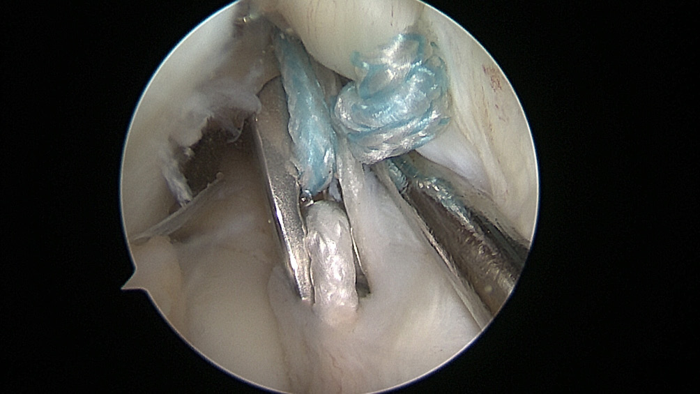 All the patients were operated on by the same team, using the same surgical technique and Neoligaments (Neoligaments) (Figure 1) or FiberTape (Biomet) (Figure 2) graft. It was fixed using Endobutton (Smith-Nephew, Watford, UK) on the femur and the interference screw, ComposiTCP30 (Biomet), on the tibia. It was prepared using the “outside-in” technique with the aimer device (Figure 3, Figure 4, Figure 5, Figure 6, Figure 7, Figure 8).