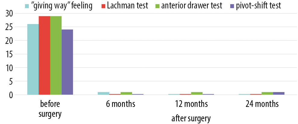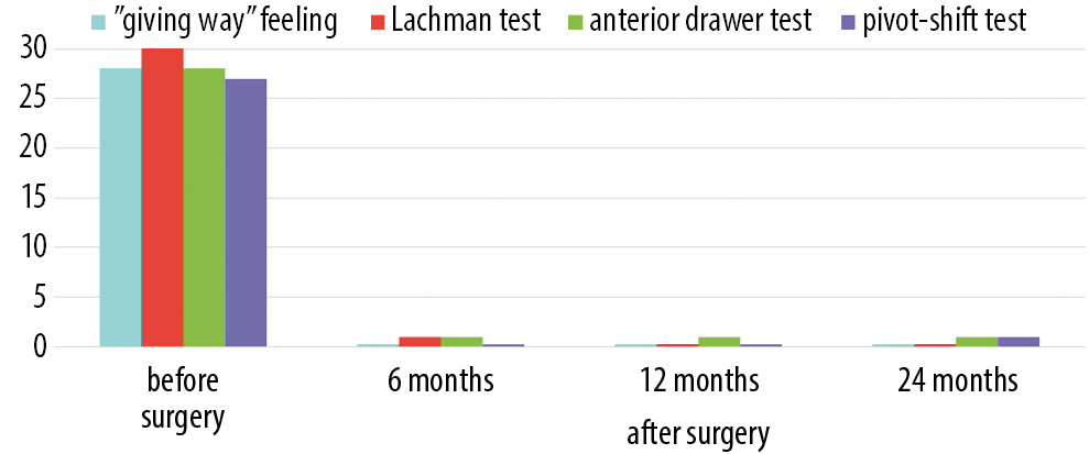 Our analysis of stability assessment in the knee joint using Lachman, anterior drawer and pivot-shift tests showed proper stability of the operated knee joint, much like in other reported studies.27, 28 No difference was found between the 12- and 24-month assessment results under the abovementioned clinical conditions. The results of a subjective assessment carried out at 12 and 24 months after stabilizing the ACL using FiberTape were comparable to the results of the primary ACL reconstruction, as reported by other authors,29 based on the Lysholm and IKDC 2000 scales.