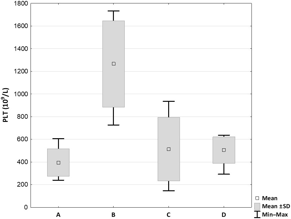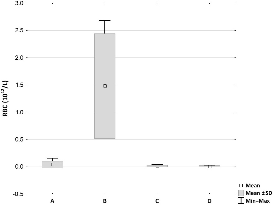 All 24 samples of prepared plasma were analyzed for the content of morphotic components using an automatic laboratory analyzer (Mindray BC-5150). The count and concentration of white blood cells (WBC), RBC and platelets were evaluated immediately after collection of the samples. Platelet capture efficiency (PCE) was calculated using the following formula: