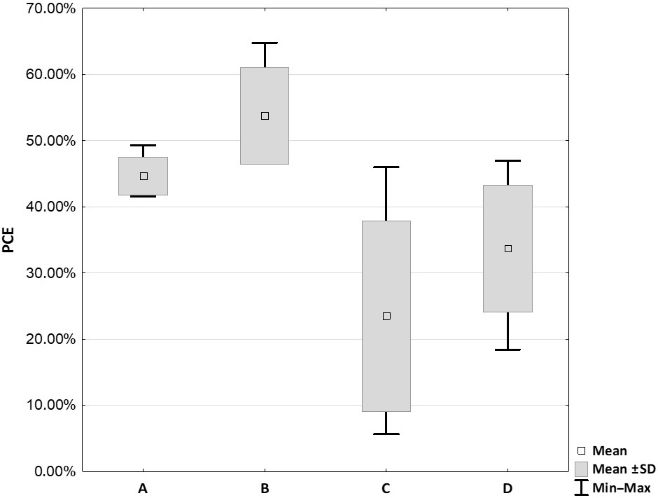 The PCE results are illustrated in Figure 2. The highest PCE score was obtained from the Mini GPS III system (53.76 ±6.66%), and the lowest from the Xerthra PRP kit (23.50 ±13.13%). The Mini GPS III System provided a significantly higher PCE then the Xerthra PRP kit (p = 0.001) and Dr. PRP (33.68 ±8.78%; p = 0.02). Although the PCE obtained from the Arthrex ACP kit (44.66 ±2.65%) was lower than that for the Mini GPS III and higher than that for the Xerthra PRP and Dr. PRP kits, the differences were not statistically significant (p = 0.061, p = 0.22, p = 1, respectively).