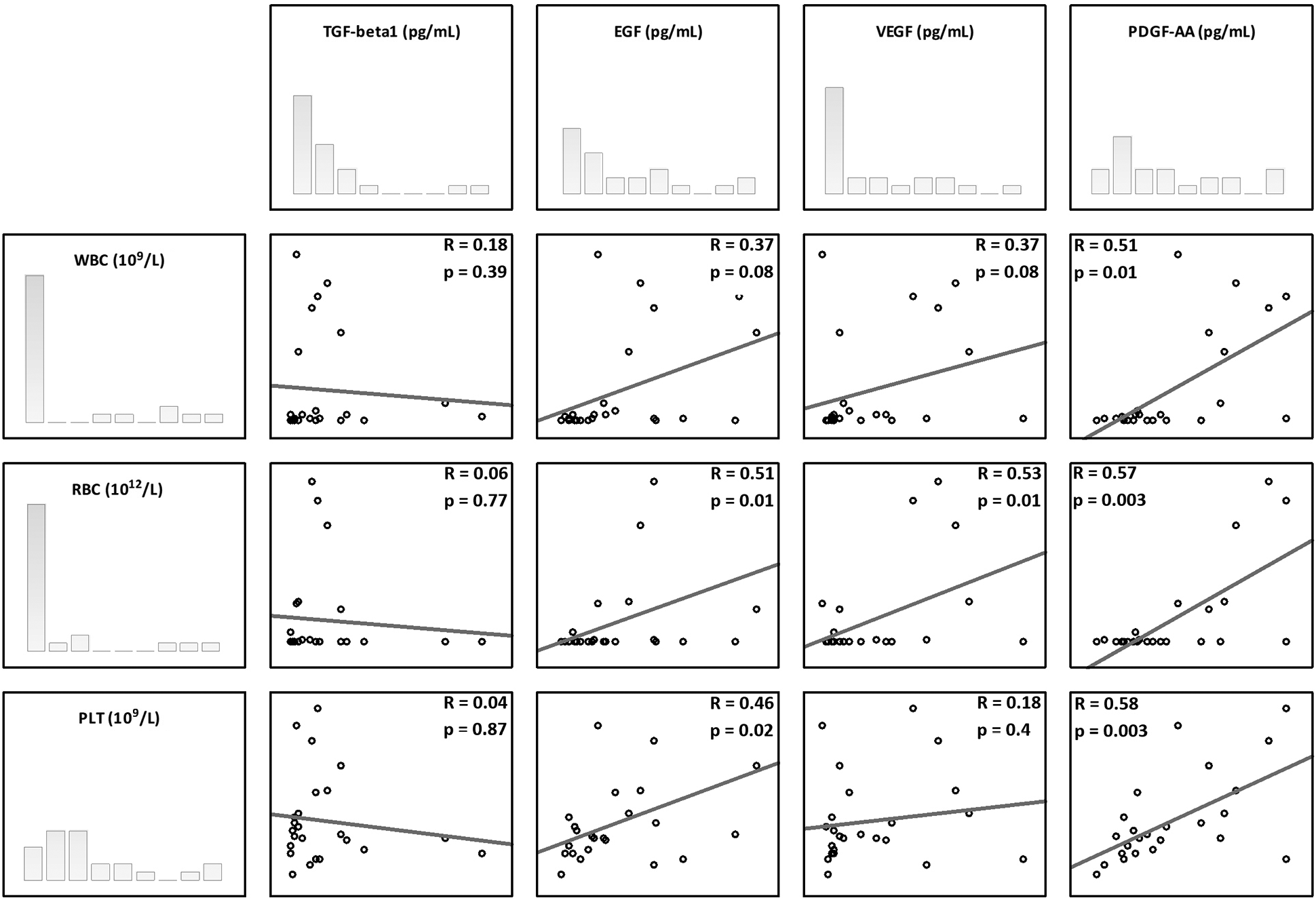 In the current study, there were significant correlations observed between platelet concentration and both EGF and PDGF-AA, but no correlations with VEGF and TGF-β1. These results are somewhat different from what has been reported previously. For example, Magalon observed significant correlations between platelet dose and all growth factors examined (VEGF, EGF, PDGF-AB, and TGF-β1).17 Similarly, Sundman also reported positive significant correlations between platelets and both TGF-β1 and PDGF-AB.29