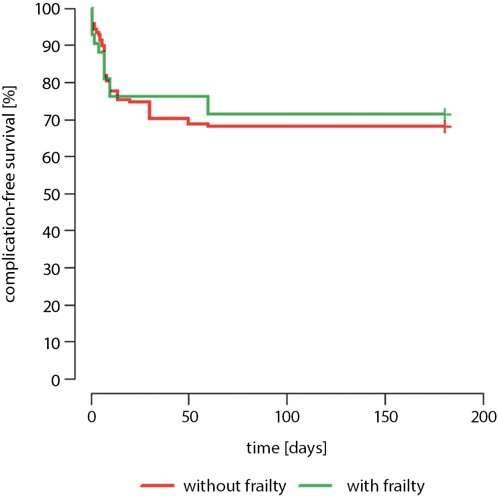 Twenty-three patients (13.5%) were rehospitalized, which included 4 patients with frailty syndrome and 19 healthy people (p = 0.737). Eight patients were rehospitalized for cardiac issues (36.5% of all hospitalizations, including 2 patients with frailty syndrome). There were no statistically significant differences between the occurrence of complications and hospitalization and the gender of the patients. On average, patients were discharged 1 week after the surgery. The complication-free survival rates between patients presenting with and without the symptoms of frailty syndrome showed no statistically significant difference (p = 0.734). The results are presented in Figure 1.