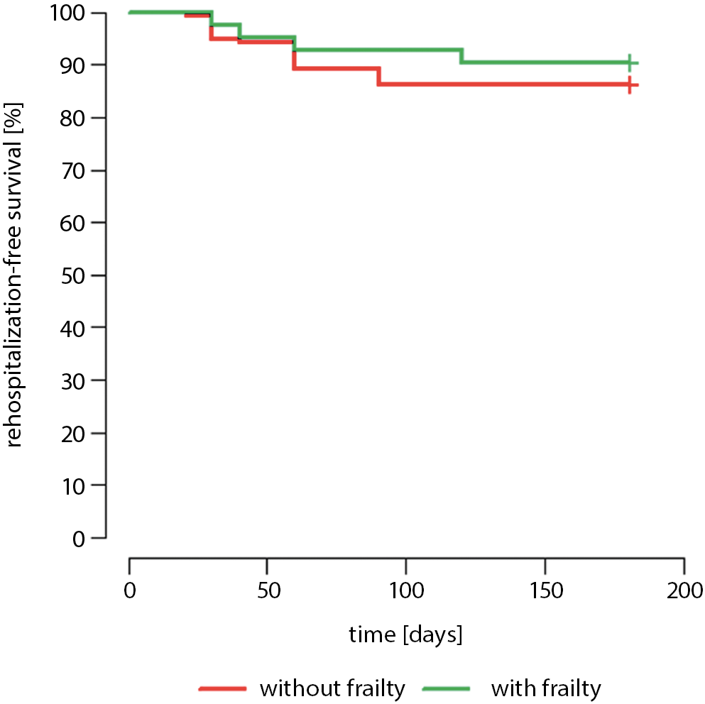 Qualitative variables were compared between groups using the χ2 test (with Yates’s correction for 2 × 2 tables) or Fisher’s exact test. The values of quantitative variables were compared between 2 groups using the Mann–Whitney test. The quantitative variables for the 2 repeated measurements were compared using the Wilcoxon test for paired data. The Kaplan–Meier curves were compared using the log-rank (LR) test. A receiver operating characteristic (ROC) curve analysis was used to compare the predictive value for patients with frailty syndrome as well as the occurrence of complications and rehospitalization. Results were considered to be significant at p-value <0.05. All of the presented statistical analyses were performed using R software, v. 4.0 (R Foundation for Statistical Computing, Vienna, Austria).12