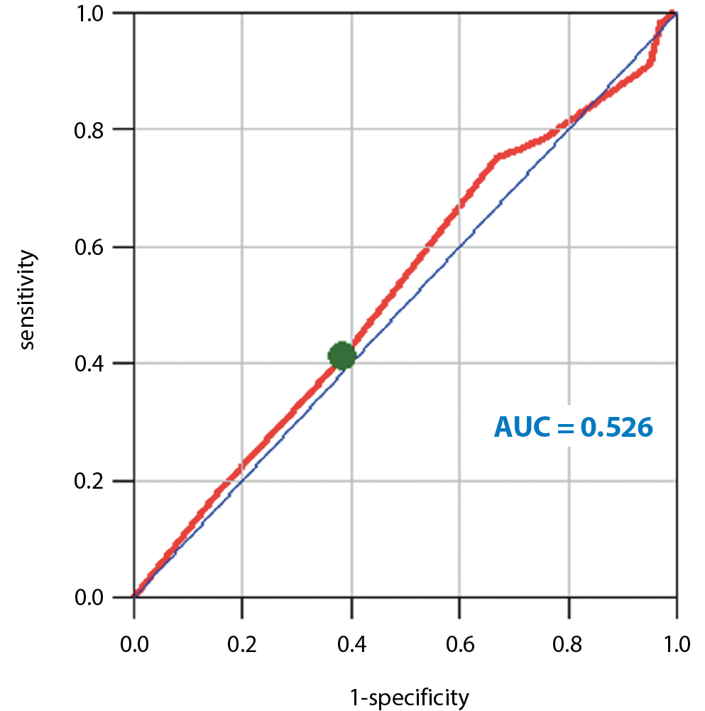 Frailty syndrome diagnosed in patients before surgery was not a significant predictor of complications: the area under the ROC curve (AUC) was 0.526. The optimal cut-off score for the TFI before surgery was 2 points. When it was more than 2 points, complications could be expected. The sensitivity was 41.1% and the specificity was 61.3%. The ROC curve is shown in Figure 3.