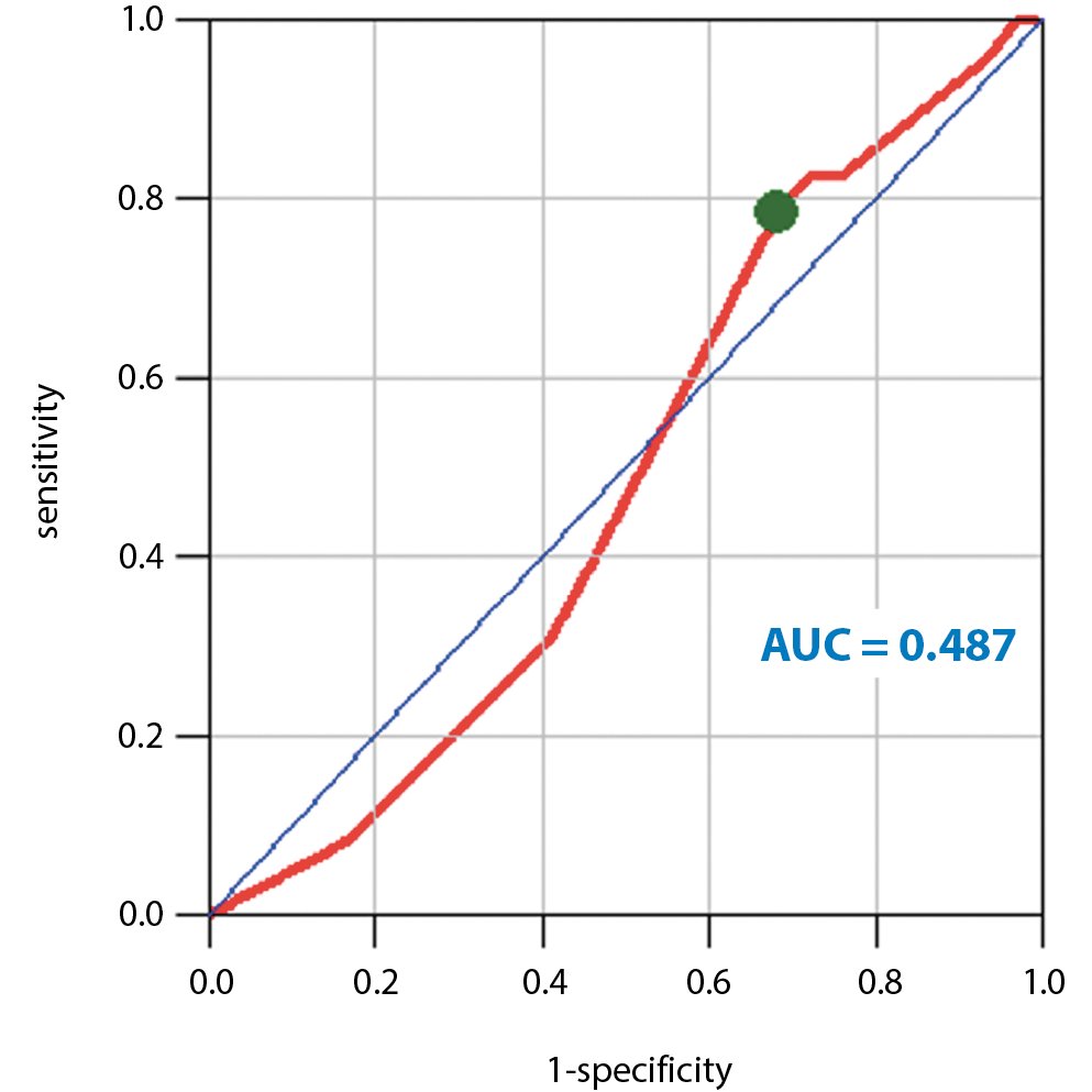 The AUC was 0.487 for TFI before the procedure, which means it was a very weak predictor of the occurrence of rehospitalization. The optimal cutoff point for the TFI before surgery in this case was 3 points.