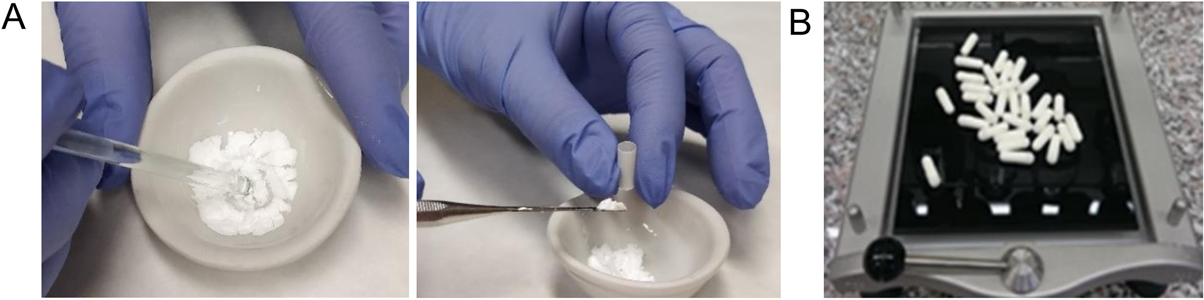 Size 3 hard gelatin capsules were prepared. For the placebo capsules, using an analytical balance, 18.0 g of lactose was weighed and then the powder was thoroughly ground in a mortar. The empty capsules were placed in the manual capsule filling machine using a positioner. The capsules were opened using the top plate of the capsule machine and the prepared powder mass was placed on the plate of the capsule machine. The powder mass was gently spread into the capsules. The capsules were then closed and removed from the capsule filling machine. Next, the gene capsules were prepared (Figure 1). On an analytical balance, 18.0 g of lactose was weighed and 1000 µL of 5 µg/µL pAAV/LacZ solution (50 µg of pDNA per capsule) was added and mixed gently. A larger amount of solution leads to overwetting of the excipient and to softening and deformation of the capsule, consequently reducing its stability. The 2nd group of gene capsules contained the rAAV vector encoding the green fluorescent protein (GFP) reporter gene. For this purpose, 0.18 g of lactose was weighed into each capsule and 4 × 104 gc of rAAV in 10 µL of water for injection was added.