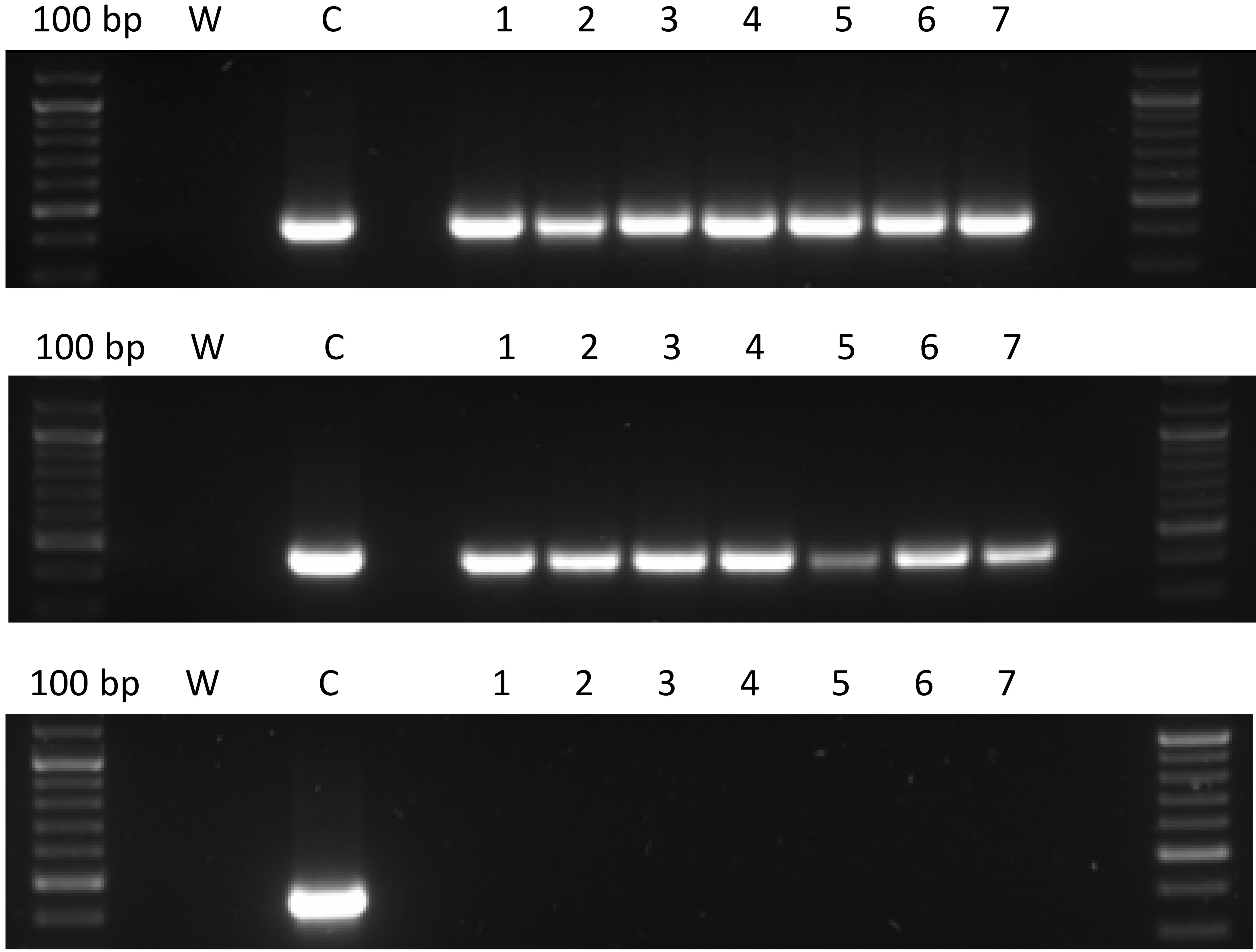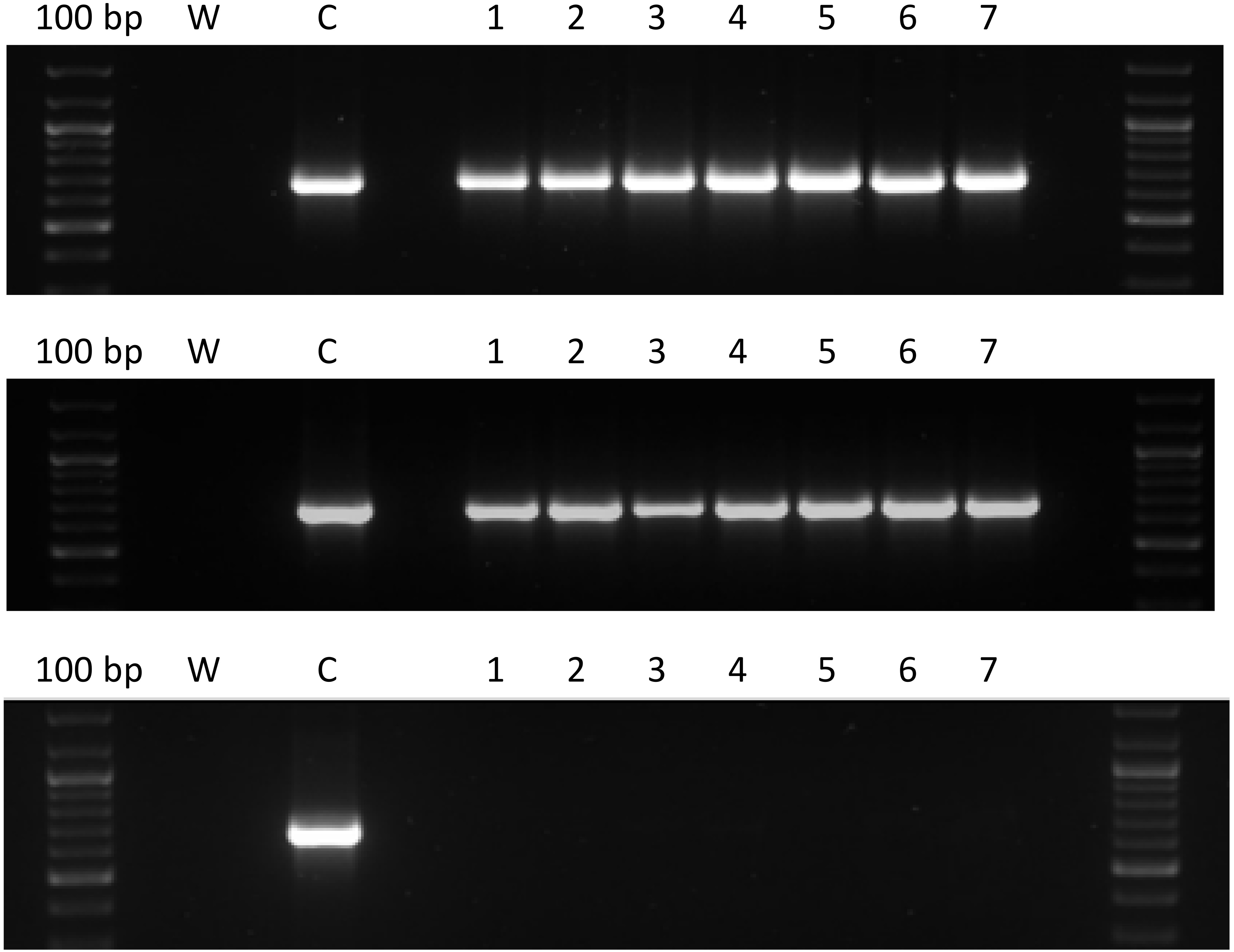 The aim of this experiment was to assess the stability and durability of the prepared capsules under the following conditions. The gene and placebo capsules were stored for 1 day, 7 days, 14 days, 30 days, 3 months, and 6 months at 4°C and room temperature (RT). After the stated times, the capsules were dissolved in water at 37°C. Seven capsules containing plasmid DNA (pAAV/LacZ) and 7 placebo capsules with only lactose were tested at each of the mentioned time intervals at both temperatures. Next, 8 µL samples were collected and PCR was performed using the 2 designed primers. Then, the samples then underwent electrophoretic separation on 1.5% agarose gel. The active substance (pAAV/LacZ) did not degrade at the 2 tested temperatures and after the indicated times, as confirmed by electrophoresis for each group. Figure 5 and Figure 6 show representative images after 1 day and 6 months, respectively, with use of the 2 types of primers.