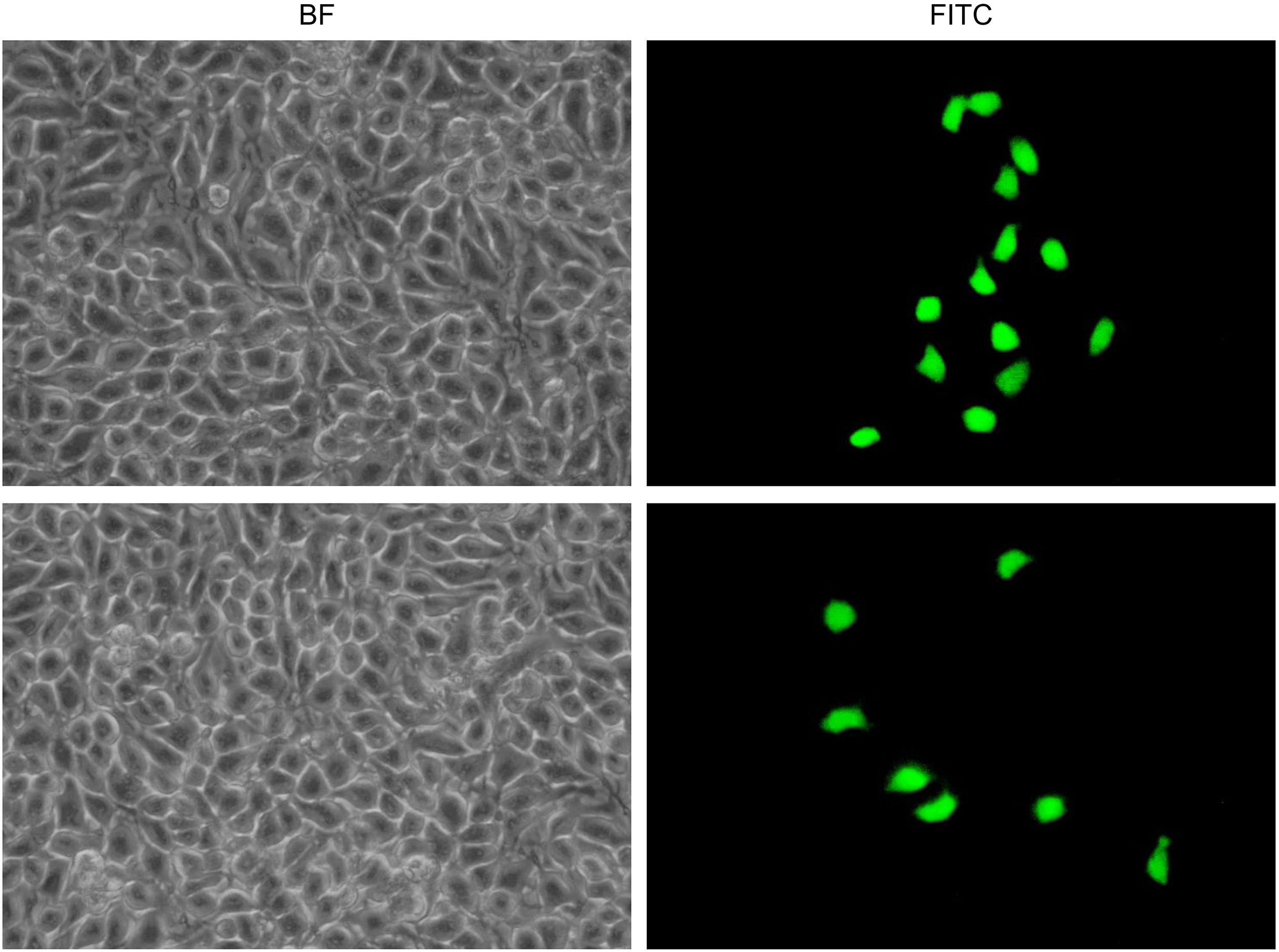 The transduction efficiency of B16-F10 cells was assessed with inverted fluorescence microscopy. Cell evaluation was performed on the 7th day of the experiment. The results are shown in Figure 7. As shown, the cells were successfully transduced with rAAV vectors released from capsules. The GFP-positive (GFP+) cells were grouped. From 4 to 14 GFP+ cells were observed in the microscope field of view. Effective transduction was documented in Figure 7, proving that the vectors carrying the reporter gene were not damaged during the overall procedure of transduction from gene capsules. During gene capsule preparation and release from the drug formulation, the rAAV vectors maintained their structure and managed to enter into the cells. The originally designed transduction procedure was successful. Moreover, the introduction of additional steps preceding transduction did not adversely affect the cell culture, as it was not infected with bacteria or fungi. These findings demonstrate the safety of the conditions used.