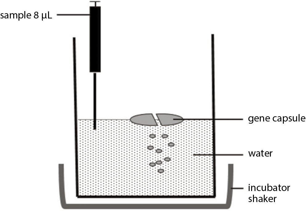 Test conditions similar to the nature and specificity of the active substance, i.e., plasmid DNA, were created. Water was used as the dissolution medium for the polymerase chain reaction (PCR) method of DNA detection. The level of HCl, phosphate buffer or NaOH recommended in the Ph Pol XI would disrupt the PCR process. Capsules were prepared as described in the “Formulation and preparation of gene capsules” section. Single capsules were placed in 250 mL beakers containing 100 mL water and placed in a shaking incubator (Jeio Tech) at 37°C and 100 rpm. Samples (8 µL) were collected every 30 s for 10 min and after 30 min (Figure 3).