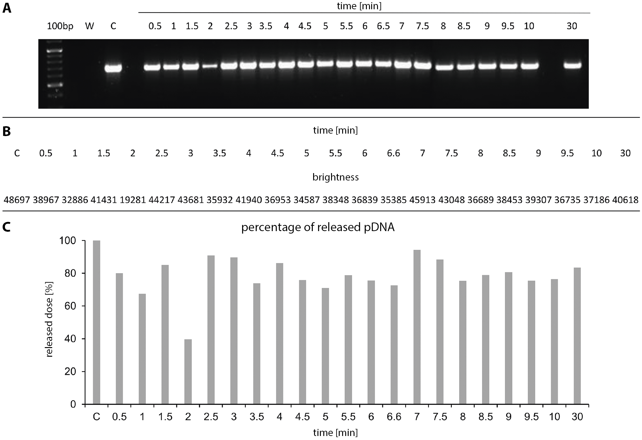 This study was performed with gene capsules containing 50 µg of plasmid each. The analyzed samples (8 µL) were collected every 30 s for 10 min and after 30 min (Figure 3). The PCR was performed. Then, the resulting products underwent electrophoretic separation in agarose gel. Plasmid release from the capsules was observed in the indicated time. After only 30 s in the sample, pAAV/LacZ was released. After 30 min, the band corresponding to the presence of pAAV/LacZ was also visible. Electrophoresis revealed that pDNA maintains the correct structure and was present in each sample. Moreover, the absence of a band in the sample marked as negative control (W) proved that the reaction was performed correctly (Figure 4A). Additionally, to assess the amount of DNA released from capsules within 30 min, the brightness intensity of the bands in the agarose gel was analyzed. The brightness values of the C band (positive control) and the other bands (showing release of pAAV/LacZ from the gene capsule within 30 min) were compared (Figure 4A). After 30 min, 83% of the DNA dose contained in the capsule was observed in the acceptor fluid (Figure 4C).