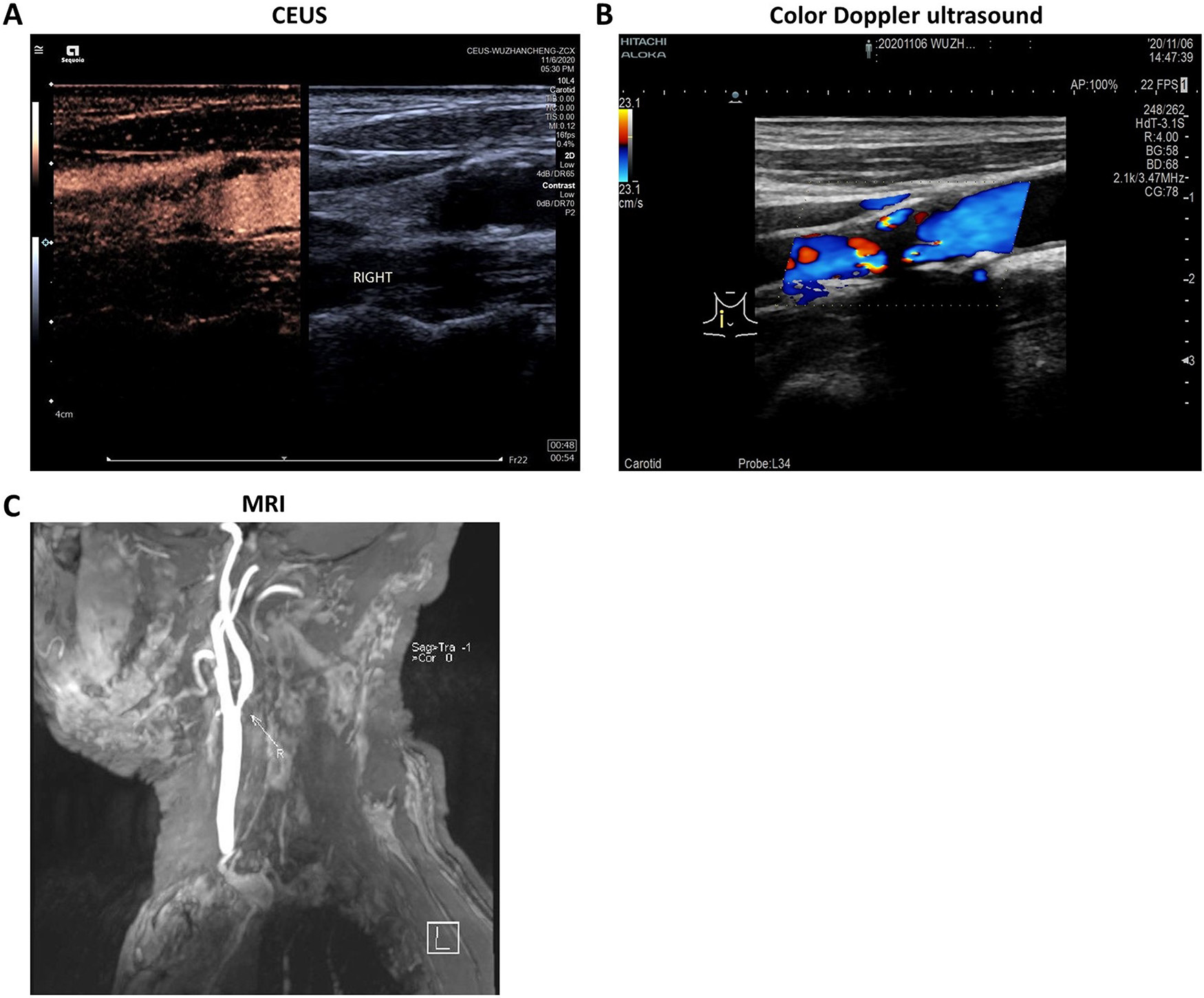 Currently, imaging studies are the main strategy for diagnosing CAS, including computed tomography (CT) scans, Doppler ultrasounds, magnetic resonance imaging (MRI), etc.7, 8, 9 Among these methods, contrast-enhanced ultrasonography (CEUS) was developed in the recent decade. It utilizes resonated ultrasound waves from circulating microbubbles to produce superior angiography-like images for vascular visualization.10 In recent years, some studies have shown the application of CEUS in diagnosing CAS plaques.11, 12 However, the clinical evidence is still inadequate.