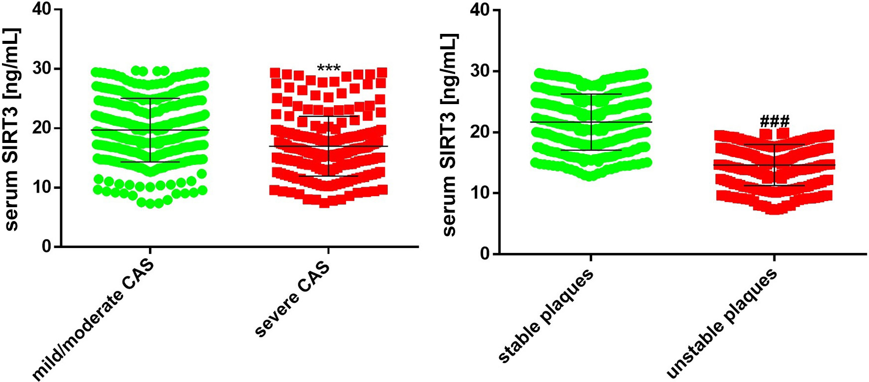 To further investigate the role of SIRT3 in CAS, serum SIRT3 levels were evaluated and compared. It was found that in severe CAS patients, the levels of SIRT3 were markedly lower than that of mild-moderate patients (U = 22220.00, p < 0.001, Figure 2) Meanwhile, patients with unstable plaques showed a remarkably lower expression of SIRT3 compared to the patients with stable plaques (U = 7899.00, p < 0.001). Patients were further allocated into high or low SIRT3 expression groups, according to their median value (17.98 ng/mL). As shown in Table 2, patients with a high expression of SIRT3 showed significantly lower levels of CRP, IL-6, TC and LDL-ch, and higher levels of HDL-ch (all with a p-value < 0.001). The percentage of patients with unstable plaques was also lower in patients with higher SIRT3 levels (p < 0.001). These results indicate that SIRT3 might be associated with the clinical severity and plaque condition of CAS patients.