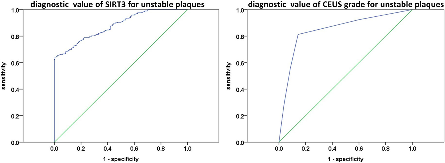 In conclusion, this study demonstrated that SIRT3 was downregulated in severe CAS patients and CAS patients with unstable plaques. A low expression of SIRT3 predicted a higher risk for unstable plaques in CAS patients. The combination of CEUS and SIRT3 showed good sensitivity and specificity for the diagnosis of unstable plaques and might be a potential strategy in the clinic.