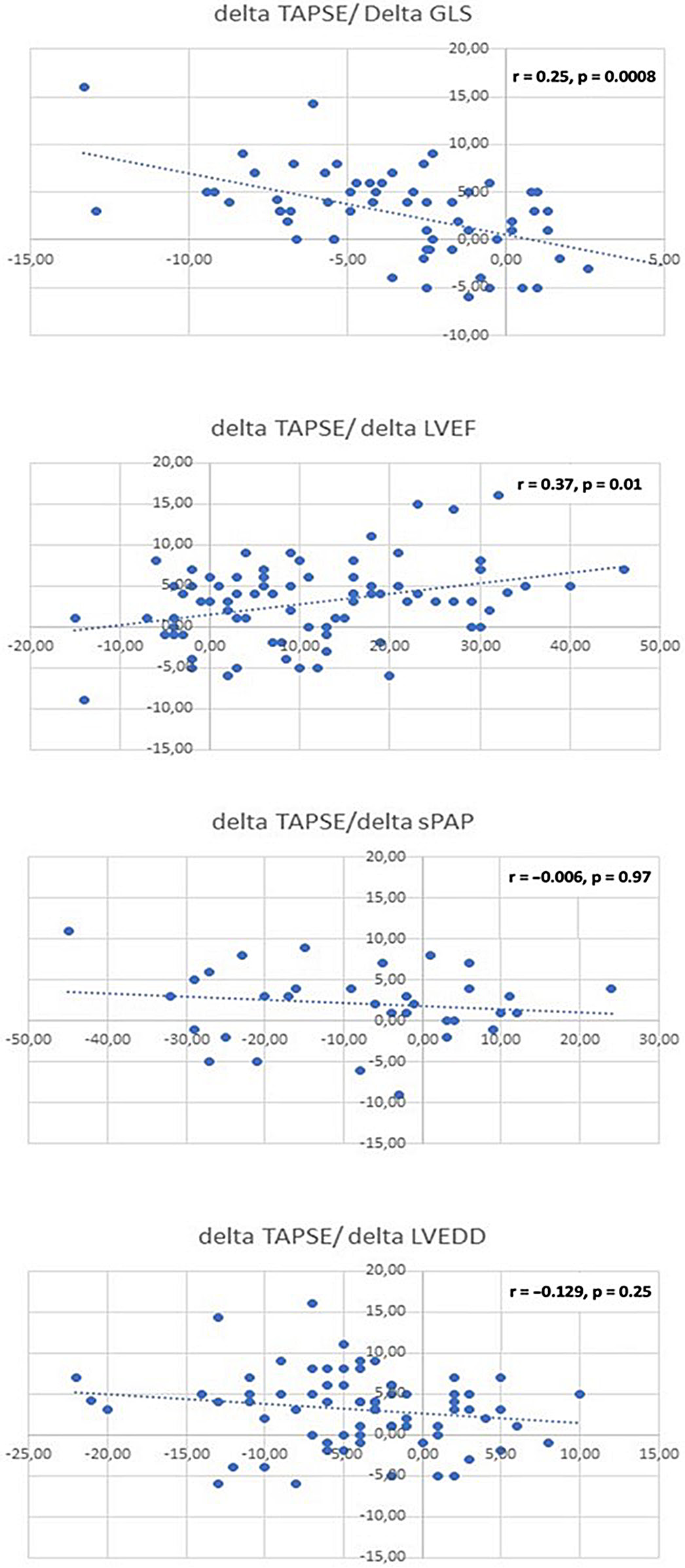 Correlations between relative variation of TAPSE and relative variation of LVEF, global longitudinal strain (GLS), left ventricular end-diastolic diameter (LVEDD) and sPAP in overall population were estimated with Pearson’s correlation coefficient.
