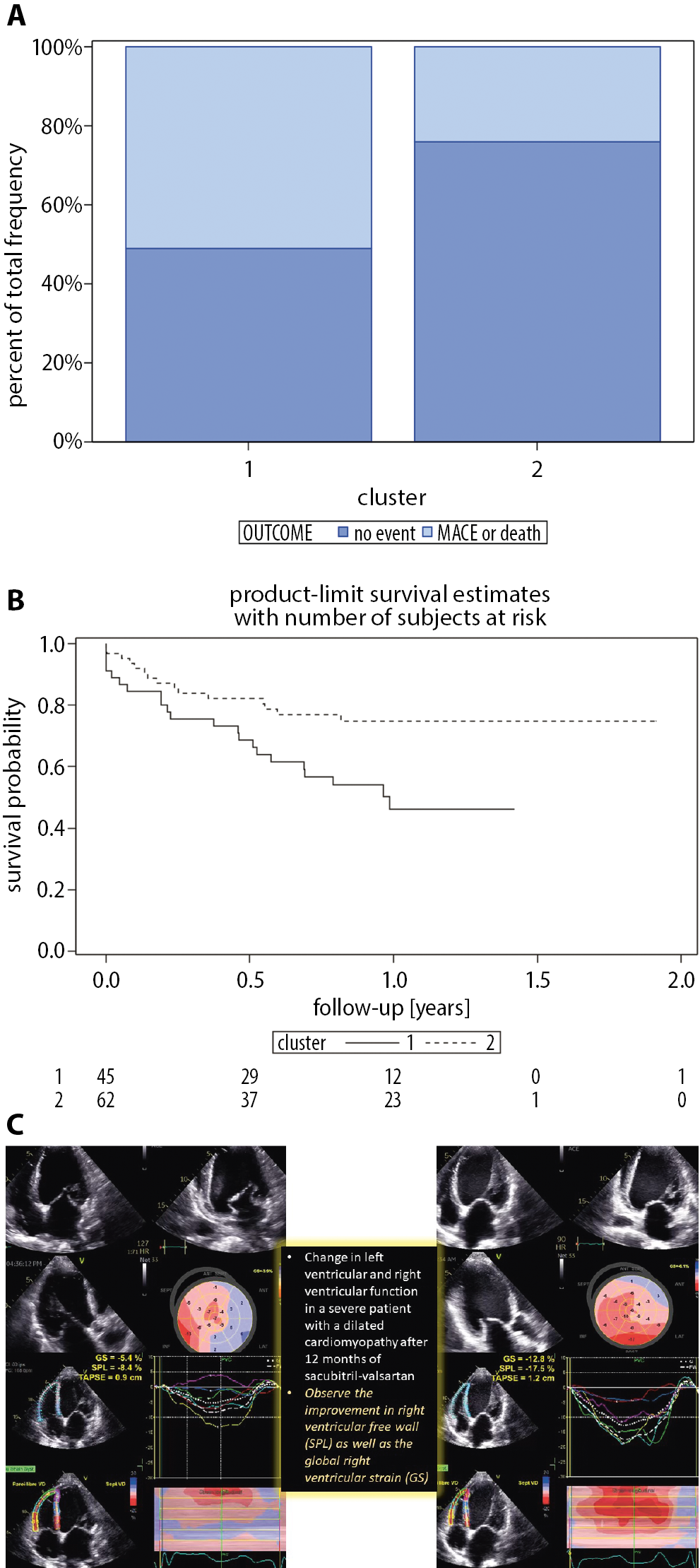 The main findings of the study are as follows: 2 patient phenotypes were identified based on the study inclusion criteria (at the initiation time of sacubitril/valsartan), and the RV function seems to be a major factor distinguishing these subsets. Cluster 1 included significantly more symptomatic and congestive patients with higher NT-proBNP levels, where RV-functional parameters were more impaired concomitantly to LVEF, LV diastolic function and renal function abnormalities. Patients included in cluster 1 had a worse prognosis regarding the primary outcome of MACEs or death. The RV function under sacubitril/valsartan was significantly improved, and TAPSE improvement significantly correlated with change in LVEF and GLS, but not with sPAP and LVEDD.
