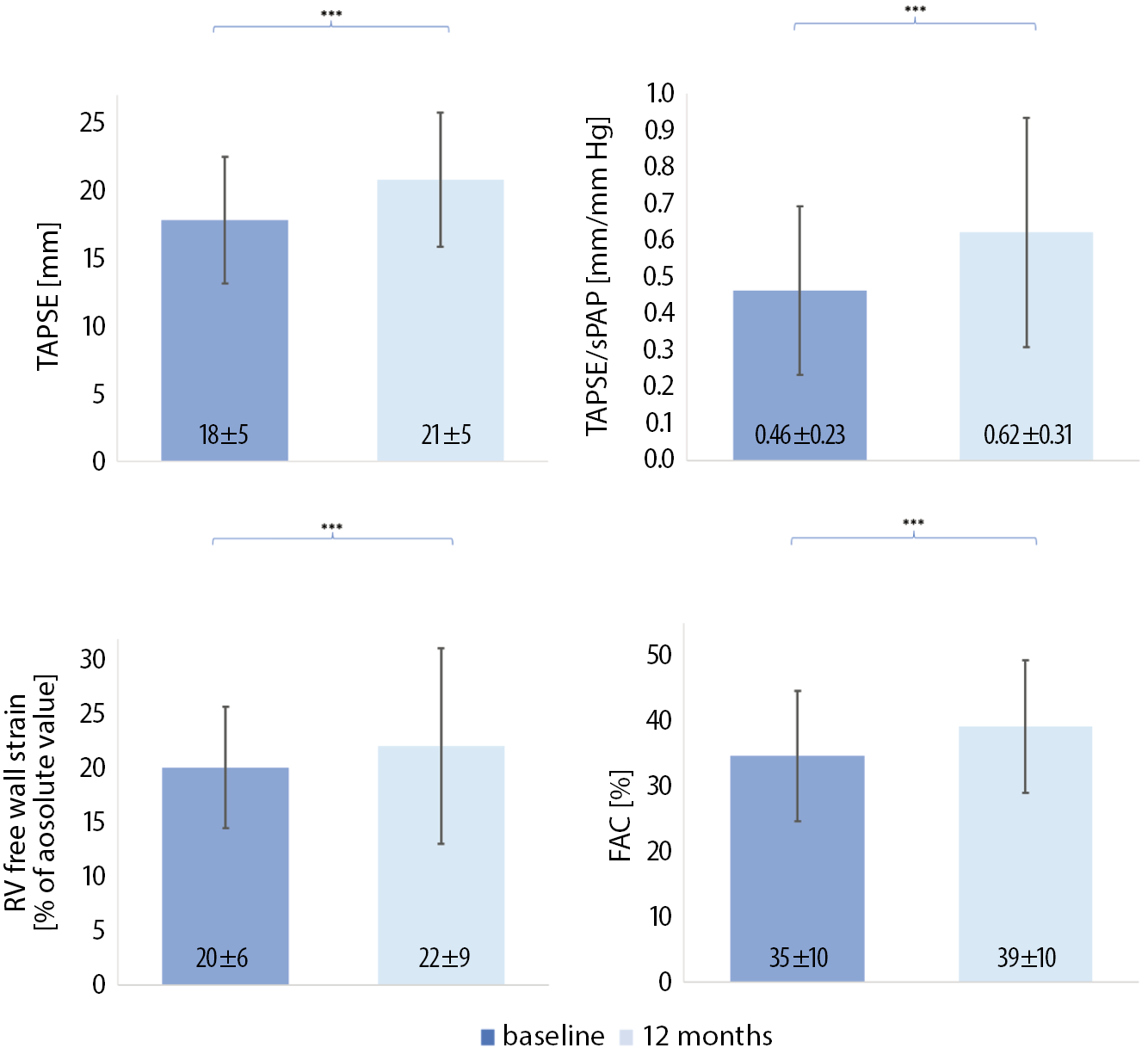 Functional parameters improvement was observed in the right heart, from baseline to 12-month follow-up, regarding TAPSE, TAPSE/sPAP ratio, RV free wall strain, and FAC (Figure 2). The TAPSE, FAC and RV free wall strain were also significantly improved in each cluster.
