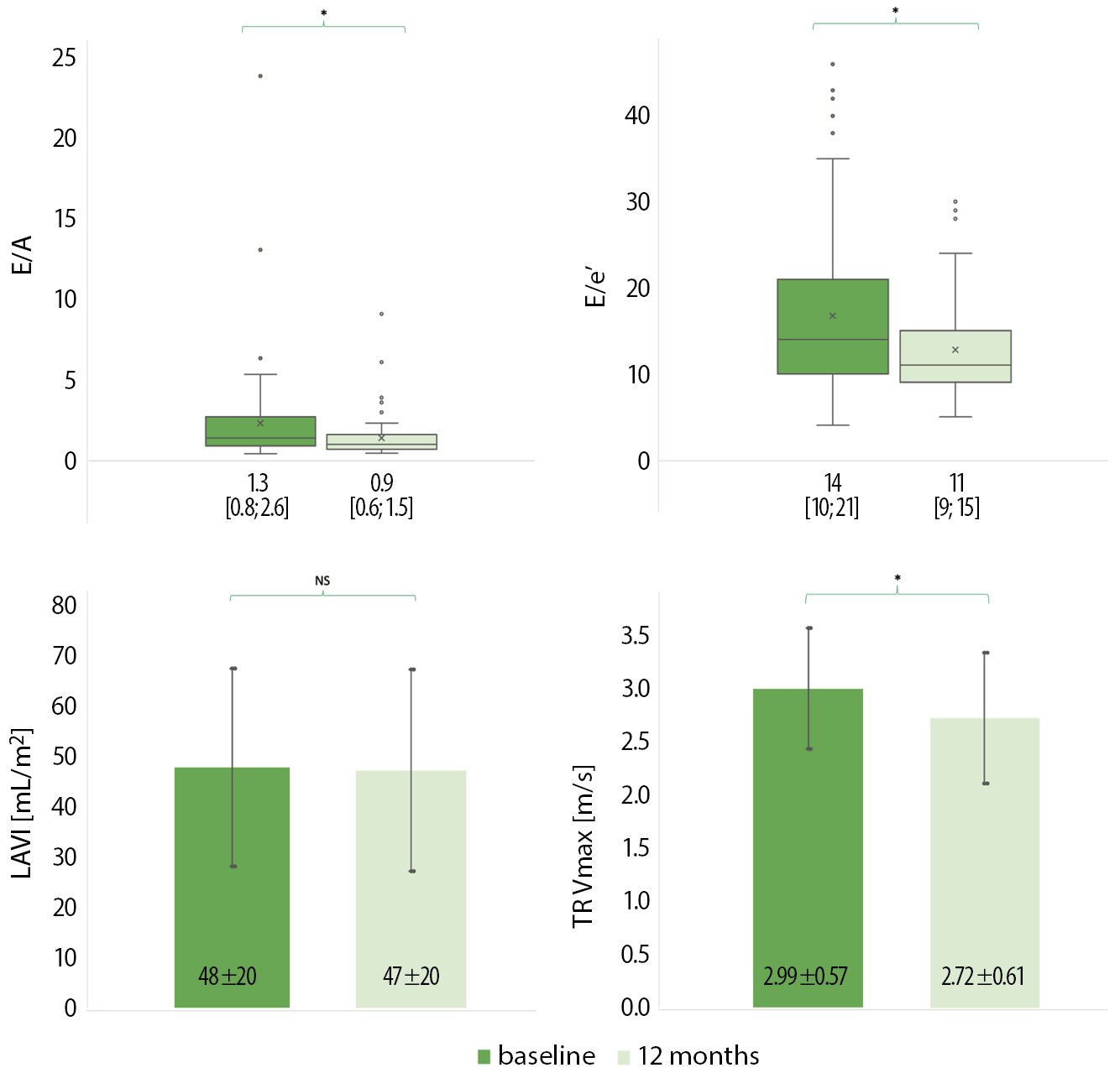 A significant LV reverse remodeling was observed from baseline to 12-month follow-up regarding LVEF (p < 0.0001), GLS (p < 0.0001) and LVEDD (p < 0.0001). The LV diastolic function parameters, including E/A, E/e’ and TR Vmax, were particularly improved from baseline to the 12-month follow-up. The LAVI did not significantly change (Figure 3).