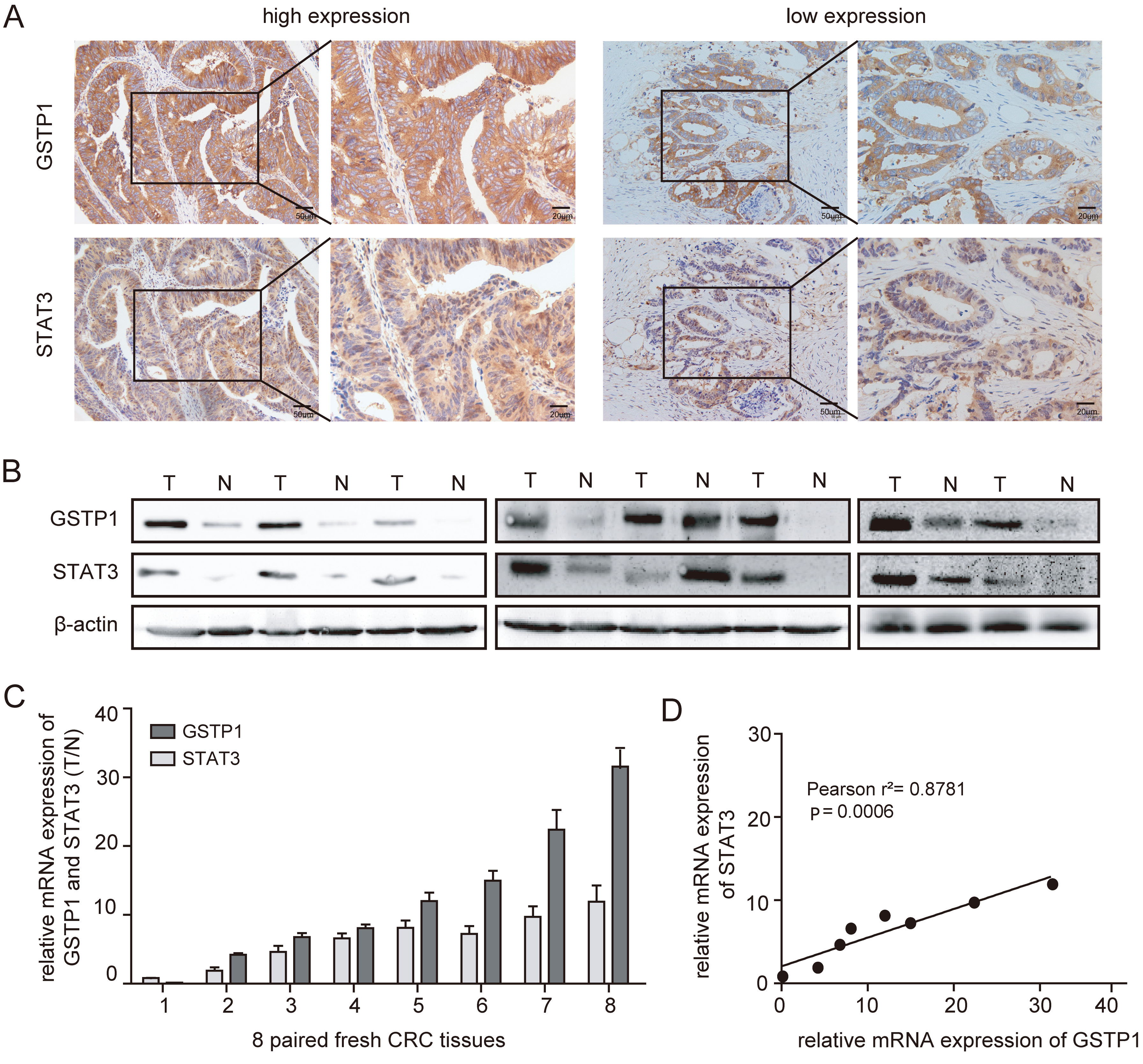 The STAT3, widely recognized as a cancer gene, is typically associated with a poor prognosis for various human malignancies, as it promotes cancer progression or metastasis.30, 31, 32, 33 The direct interaction between GSTP1 and STAT3 can promote HCC progression,8 and our previous study found that GSTP1 could be ubiquitinated by FBX8, thus inhibiting its function in promoting CRC proliferation, invasion and metastasis.29 Therefore, immunohistochemistry (IHC) was used to detect the expression of GSTP1 and STAT3 in 20 human CRC tissue samples. The results demonstrated that the expression levels of GSTP1 and STAT3 in human CRC tissues were positively correlated (Figure 1A). Western blotting and qRT-PCR were used to detect the expression levels of GSTP1 and STAT3 in 8 paired fresh CRC tissue samples (Figure 1B,C), and the results of these 2 experiments showed that the expression patterns of GSTP1 and STAT3 were highly correlated. After statistical analysis, it turned out that the expression of GSTP1 was positively correlated with the expression of STAT3 in the paired fresh CRC tissue samples, as shown in Figure 1D (Pearson’s correlation analysis, two-tailed test, r2 = 0.8781, p = 0.0006).
