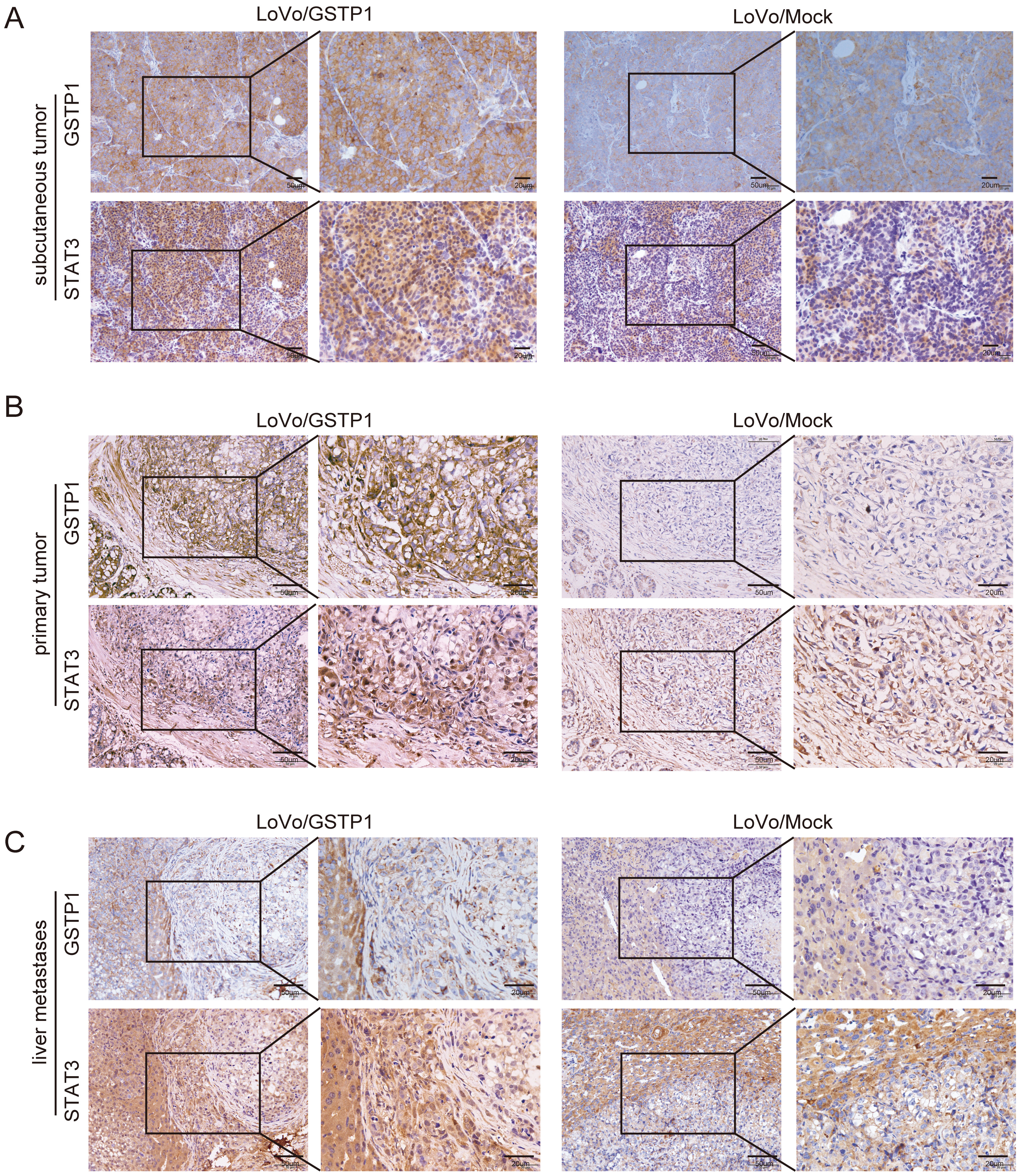 The expression of GSTP1 was positively correlated with the expression of STAT3. Taking into account previous studies, it was predicted by authors that GSTP1 might play a role in CRC progression by regulating STAT3. Therefore, the SW620 and HCT116 cell lines which stably knockdown GSTP1 were constructed (Figure 2A). Next, STAT3 was overexpressed in the above 2 cell lines; the results showed that the overexpression of STAT3 was successful (Figure 2A). Therefore, the SW620/shGSTP1/STAT3 and HCT116/shGSTP1/STAT3 cell lines were used to perform relevant recovery experiments. The results showed that the overexpression of STAT3 could significantly promote the invasion (Figure 2B) and proliferation (Figure 2C) of cells in the GSTP1-knockdown group in vitro. Besides, the expression levels of STAT3 and GSTP1 were detected in subcutaneous tumors (Figure 3A), in situ implants (Figure 3B) and liver metastases (Figure 3C) of CRC in the nude mouse tissues obtained from a previous study. The results demonstrated that in these 3 tumor tissues, the expression of STAT3 was significantly upregulated in the GSTP1 overexpressed group, which indicated that the expression levels of GSTP1 and STAT3 in the mouse tissue samples were consistent.