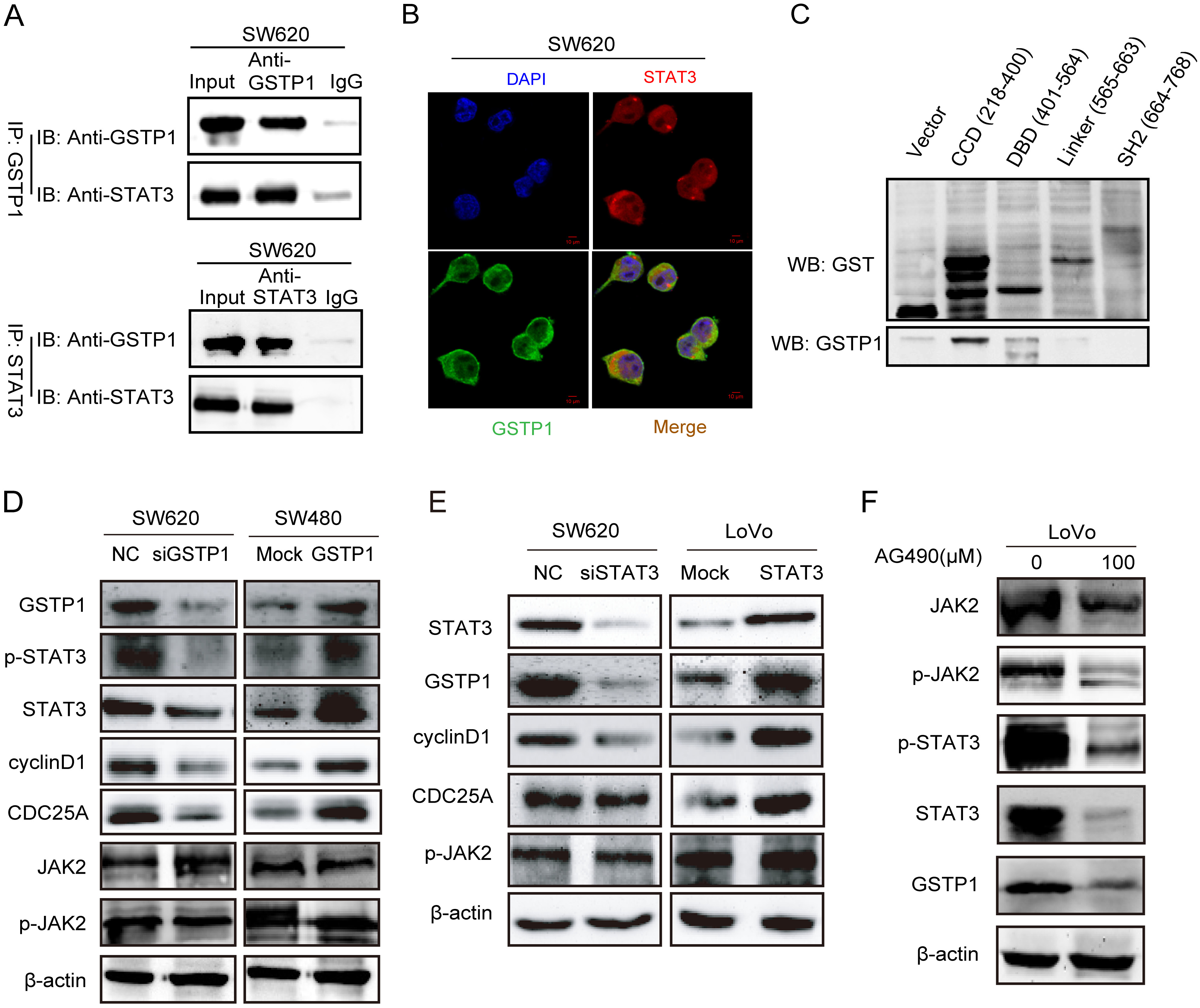 Materials and methods. In the present study, immunohistochemistry (IHC) and the quantitative reverse transcription polymerase chain reaction (qRT-PCR) analysis were used to detect the expression of GSTP1 and signal transducer and activator of transcription 3 (STAT3) in CRC tissues. Western blotting was applied to detect the expression of GSTP1 and proteins of the Janus kinase (JAK)-STAT3 pathway in different CRC cell lines. The interaction and co-localization of GSTP1 and STAT3 were detected using co-immunoprecipitation (co-IP) and immunofluorescence (IF) in the SW620 cell line.