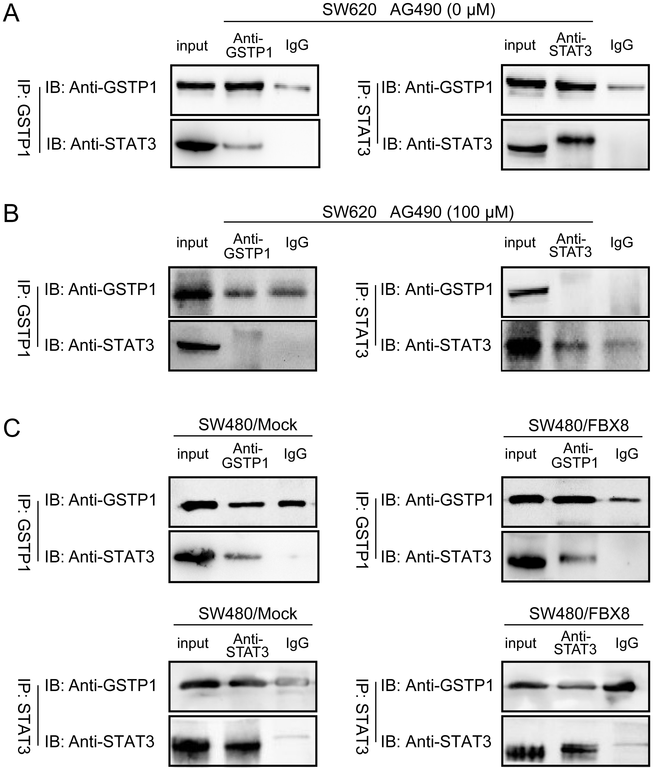 As a downstream target of FBX8, GSTP1 can interact with STAT3. Therefore, it was predicted that FBX8 could regulate the interaction between GSTP1 and STAT3. The co-IP analysis demonstrated that there was an interaction between GSTP1 and STAT3 in the SW620 cell line, with a high endogenous expression of FBX8 (Figure 5A). However, after adding AG490, a specific inhibitor of JAK2, the signal transduction of the JAK2 pathway was inhibited, resulting in a significant decrease in the expression of STAT3 in the SW620 cell line. In comparison with the group without AG490, the STAT3 that GSTP1 could bind to was also significantly reduced (Figure 5B). Simultaneously, in the SW480 cell line with the overexpression of FBX8, the expression of STAT3 detected with a co-IP assay was significantly reduced as compared to the control group (Figure 5C). These results indicated that FBX8 was a suppressive factor for the combination of GSTP1 and STAT3.