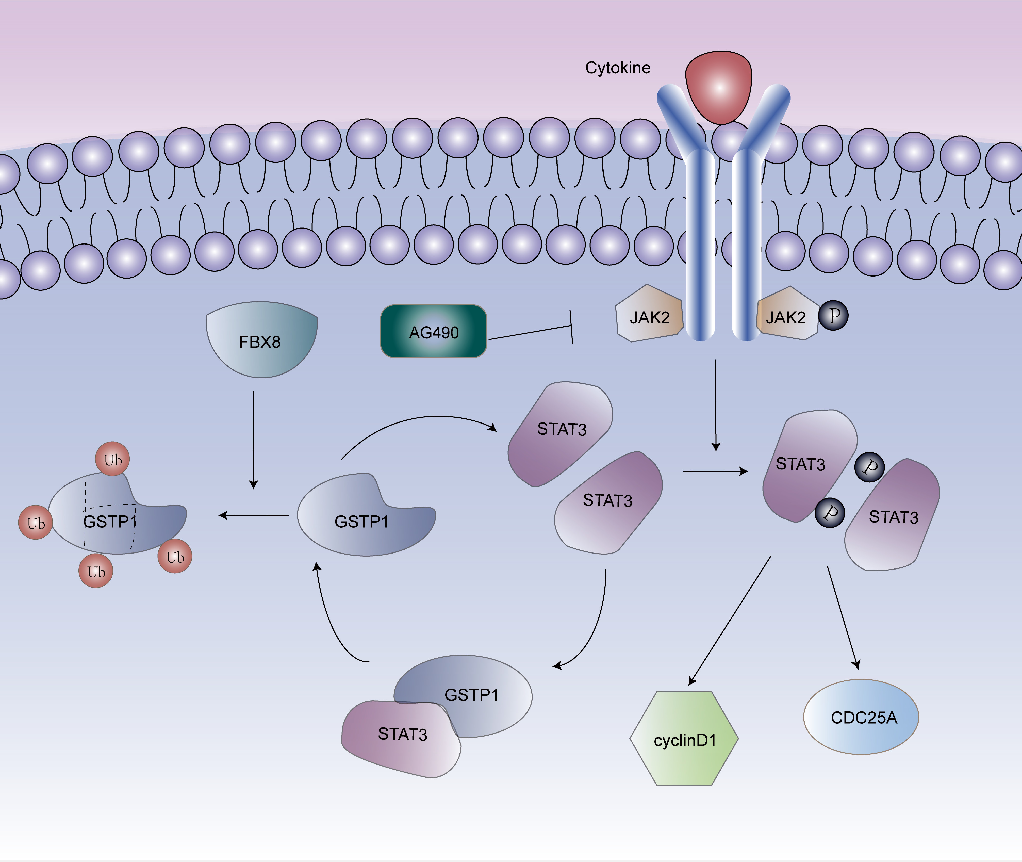 Therefore, identifying the association between GSTP1 and the STAT3 pathway is a meaningful way to illustrate the molecular mechanisms of GSTP1 in CRC. This study confirmed the interaction between GSTP1 and STAT3 and proved that GSTP1 positively regulates the STAT3 signaling pathway, leading to changes in target genes, such as p-STAT3 and STAT3, cyclin D1, and CDC25A. The STAT3 siRNA significantly abolished increases in STAT3, cyclin D1 and CDC25A and decreased the protein expression of GSTP1, but there was no change in p-JAK2. Exogenous STAT3 exhibited adverse results. Besides, western blotting revealed a concentration-dependent decrease in the level of JAK2, p-JAK2, STAT3, p-STAT3, and GSTP1 after 24 h of treating LoVo cells with the specific inhibitor of JAK2 (AG490). These results demonstrated that GSTP1 interacted with STAT3 without the involvement of JAK2. With regard to the previous research showing that FBX8 can degrade the expression of GSTP1,29 it was speculated that FBX8 could affect the association of GSTP1 and STAT3. Subsequent experiments confirmed that FBX8 was a restraining factor for the combination of GSTP1 and STAT3.