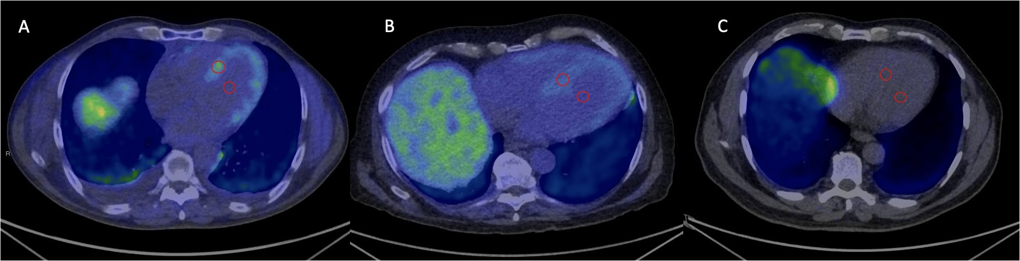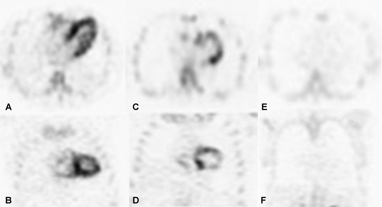 Positron emission tomography (PET) using the Pittsburgh compound-B (PiB) radiotracer is another recommended method of examination that uses radiotracers. Pittsburgh compound-B is a radioactive 11C-labeled analog of thioflavin T, originally used for imaging beta-amyloid plaques in the brain tissue in the diagnosis of Alzheimer’s disease. The PiB radiotracer binds directly to the amyloid protein in both ATTR-CA and AL-CA. The myocardial uptake is quantified in relation to the blood activity of the heart cavities, adopting different breakpoints for the 2 types of amyloidosis. The normal myocardial/blood uptake ratio is approx. 1.50