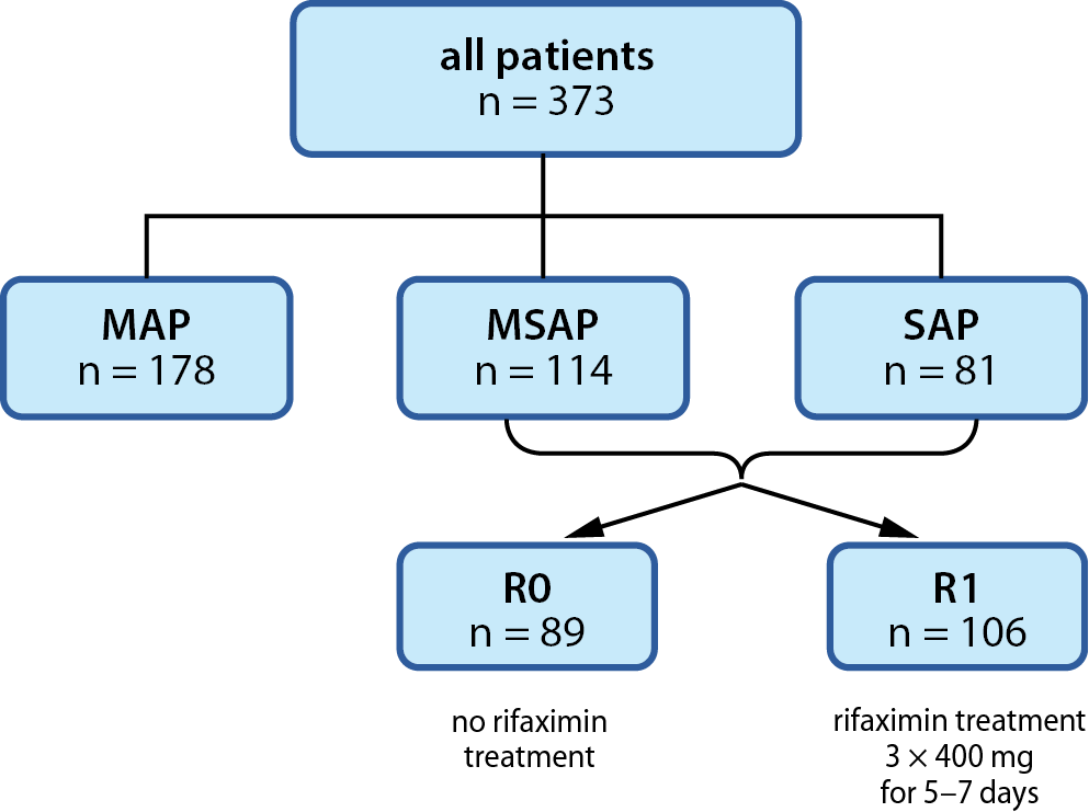 Starting from the cut-off point of the year 2009, the patients admitted to the Gastroenterology Department who started to manifest features of MSAP or SAP received immediate rifaximin therapy through enteral feeding tube along with enteral nutrition. The treatment protocol of rifaximin therapy was arranged as follows; patients were administered rifaximin 3 times per day at a dose of 400 mg (for at least 5 days and up to 7 days), comparably to the maximal dosage of this drug in other registered indications in Poland.
