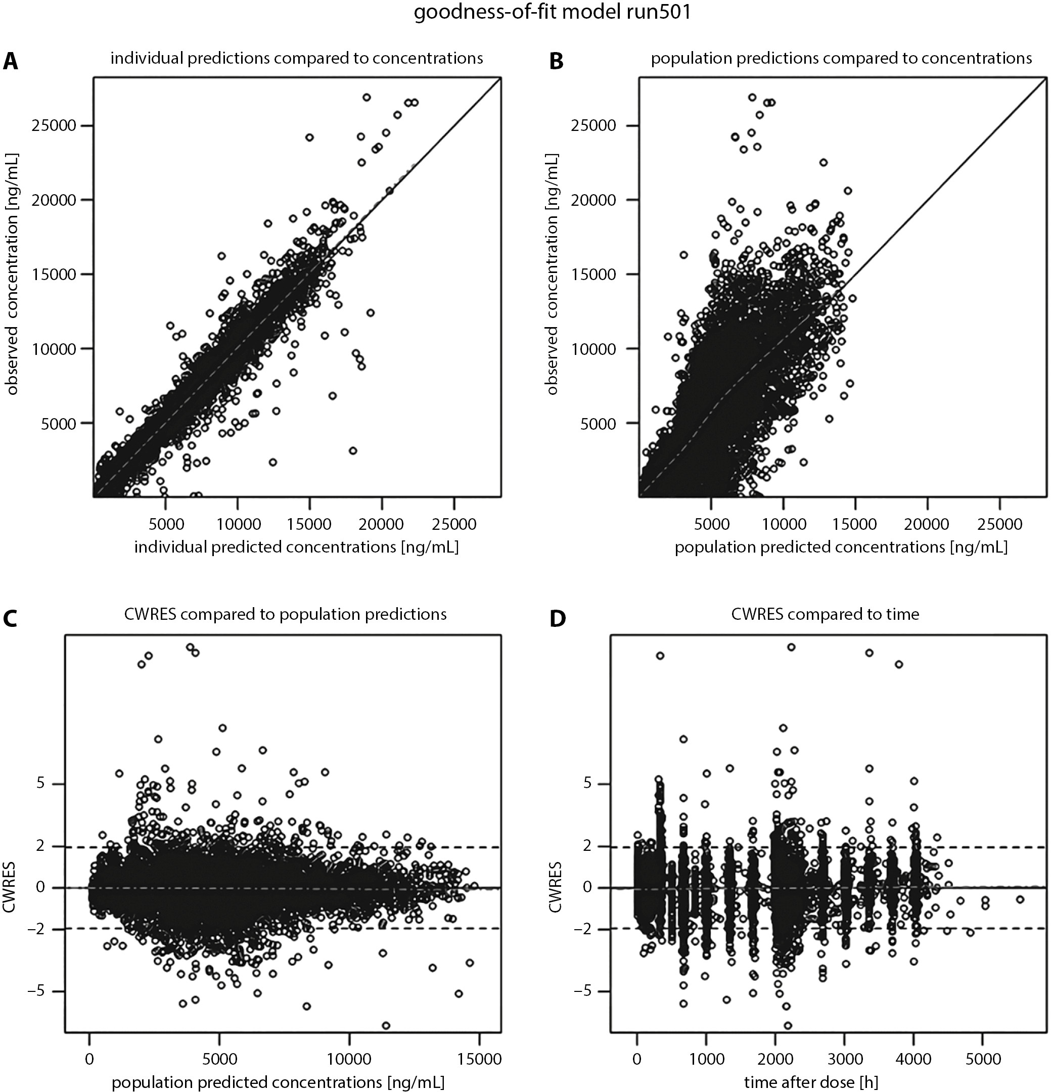 The GOF plots of the PK population final model are displayed in Figure 3. The plots exhibited good correlations between an individual prediction and the observation with lines of identity and trend line overlaid, and the individual predictions fitting the identity line well. This finding has proven the excellent predictive power of the model. The conditional weighted residual error had no misspecification of residuals related to population predictions (PRED) and time, was mostly distributed within ±5 and was well distributed along the zero-line relative to PRED.