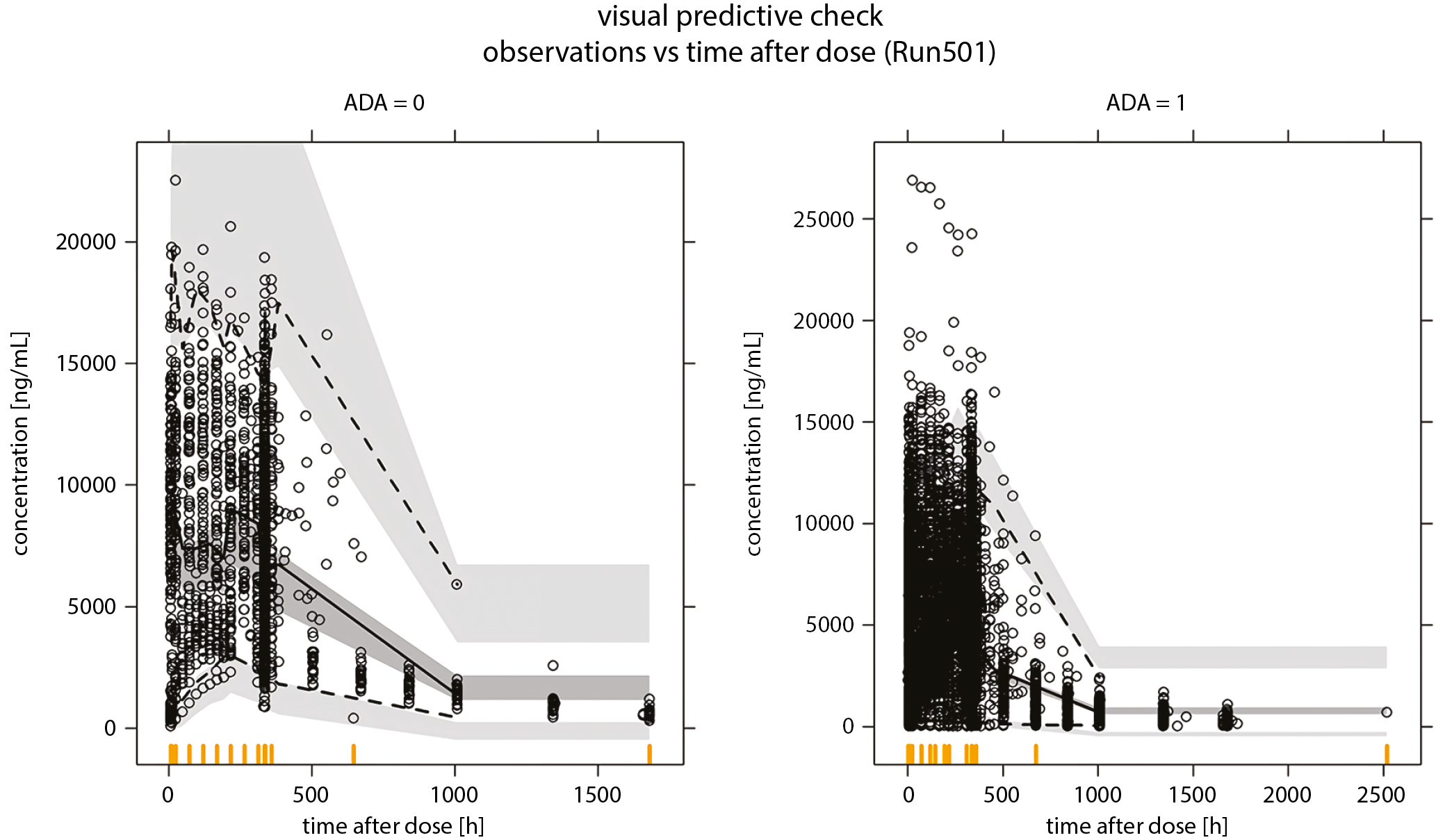 The VPC was used to determine the predictive accuracy of the final model (Figure 4). A total of 1000 simulated duplicates of the PK dataset were produced from the estimates derived from the final model. The model described the observed data well, and 50th percentiles of measured drug concentrations generally fell within the prediction of 90% CI, suggesting that the model produced a good description of the PK parameters of HS016 and adalimumab.
