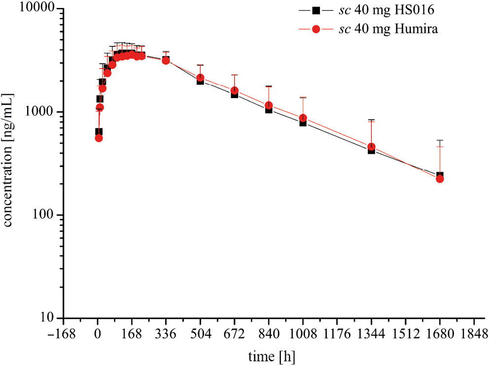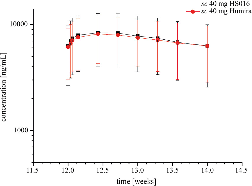 Figure 1 shows the mean serum concentrations of HS016 and adalimumab in the phase 1 study, following the administration of single 40 mg subcutaneous doses. Figure 2 shows the results from the phase 3 study of the mean serum HS016 and adalimumab concentrations at week 12, after the administration of 40 mg subcutaneous doses once every 2 weeks. After single and multiple doses, the PK profiles of HS016 and adalimumab were virtually identical. Only 1 declining phase of the logarithmic serum concentration time courses of adalimumab and its biosimilar HS016 were analyzed.