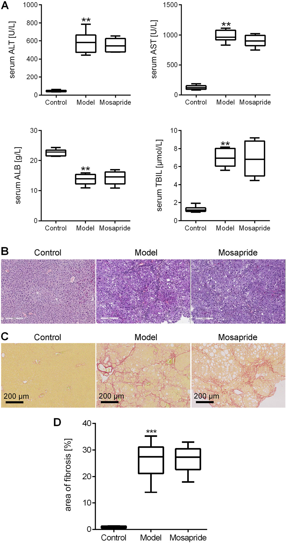 Three rats in the model group and 2 rats in the mosapride group died at the end of the 12-week experiment. The CCl4 significantly increased the level of alanine aminotransferase (ALT) (p = 0.0022), aspartate aminotransferase (AST) (p = 0.0022) and total bilirubin (TBIL) (p = 0.0022) (all p-values were calculated using Mann–Whitney test). Serum albumin (ALB) was significantly decreased by CCl4 (p = 0.0022; Mann–Whitney test) (Figure 1A). The H&E and Picrosirius red staining indicated that the normal liver structure was severely destroyed with significant fibrous septa and cirrhotic nodules in the model group (Figure 1B,C). The quantification of Picrosirius red staining showed that the fibrotic area was 0.70 (0.52, 1.15) in the control group, 27.42 (22.33, 30.16) in the model group, and 27.32 (23.21, 29.87) in the mosapride group (Figure 1D). The CCl4 significantly induced fibrosis in the model group compared to the control group (p < 0.0001; Mann–Whitney test), while no significant difference was observed between model and mosapride groups (p = 0.9502; Mann–Whitney test).