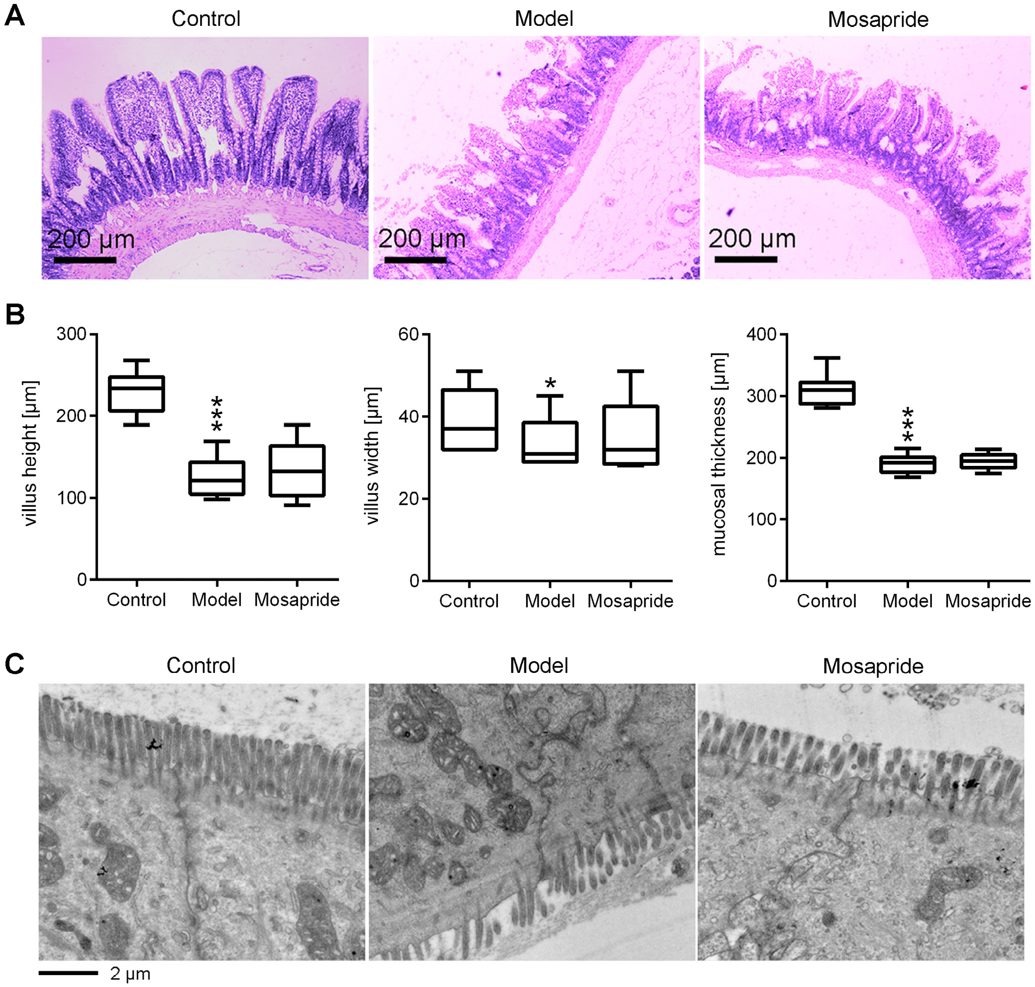 As illustrated in Figure 3A, the ileum tissues of the control rats displayed a normal intact architecture of intestinal mucosa without hyperemia, edema or inflammatory cell infiltration. The villi were well arranged, smooth and intact. In the model and mosapride groups, the mucosa was destructed with atrophic and shorter villi. As presented in Figure 3B, the villi height and width, as well as the thickness of mucosa in the model group were significantly decreased compared to the control group (p < 0.0001, p = 0.0417 and p < 0.0001, respectively; Mann–Whitney test). There were no differences in the villi height, villi width and thickness of mucosa between the model group and the mosapride group (p = 0.5601, p = 0.9155 and p = 0.7135, respectively; Mann–Whitney test). Representative images of intestinal ultrastructural changes were shown in Figure 3C. The epithelial cells in the control group were tightly arranged with neatly arranged surface microvilli. The paracellular spaces were narrow and the tight junctions of the epithelial cells in the control group were intact and clear. By contrast, the tight junctions were discontinuous and the paracellular spaces were widen in both, the model group and the mosapride group.