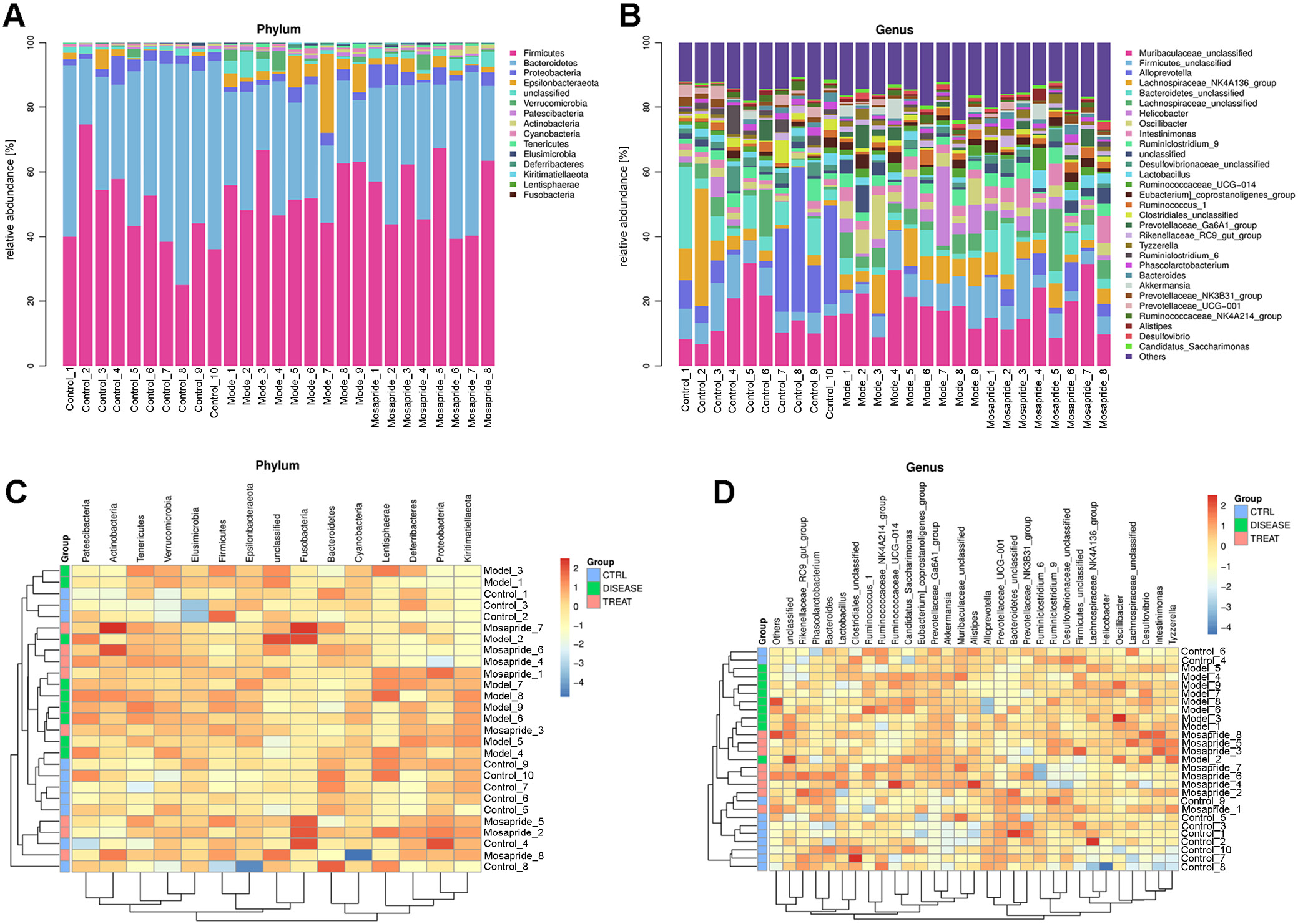 We analyzed the abundance of intestinal bacteria among 3 groups at the phylum and genus levels, and the results are shown in Figure 4A,B. In the control group, Bacteroidetes were the most abundant, followed by Firmicutes and Proteobacteria. In the model group, Firmicutes were the most abundant, followed by Bacteroidetes and Epsilonbacteraeota. In the mosapride group, the top 3 abundant bacteria were Firmicutes, Bacteroidetes and Proteobacteria. Figure 4C,D showed the clustering analysis of intestinal bacteria in the heat map. In the model group, there was a decrease of Prevotellaceae, Bacteroidetes, Alloprevotella, Desulfovibrionaceae, Phascolarctobacterium, Eubacterium, Clostridiales, and Ruminiclostridium when compared to the control group, which showed an increase after the administration of mosapride. In contrast, Firmicutes, Prevotella, Oscillibacter, Helicobacteria, Candidatus, Muribaculaceae, and Akkermansia were increased in the model group, and they decreased after the administration of mosapride. The levels of Lachnospiraceae, Intestinimonas and Tyzzerella showed an increase in the model group compared to the control group, and a further increase after mosapride administration.