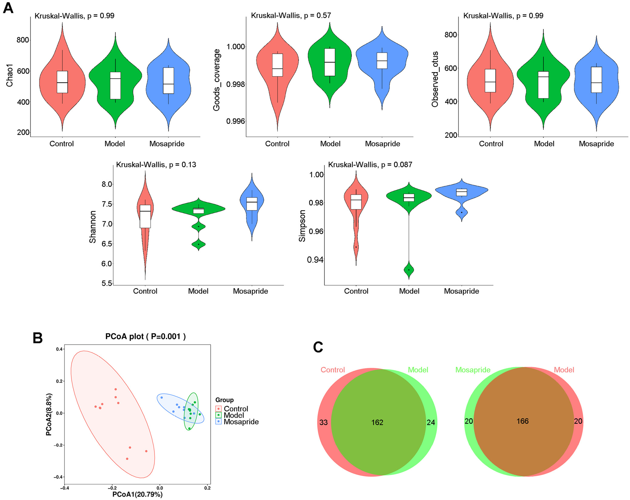 The alpha diversity analysis was carried out to determine the bacterial diversity at the genus level among the 3 groups. The violin plot showed no statistical differences in alpha diversity among the control, model and mosapride groups based on Chao1 (p = 0.99), Good’s coverage (p = 0.57), OTUs (p = 0.99), Shannon’s index (p = 0.13), and Simpson’s index (p = 0.087) (all p-values were calculated using Kruskal–Wallis test) (Figure 5A and Supplementary Information, File 2). This indicated that there was no statistical difference in alpha diversity of gut microbiota among the control group, the model group or the mosapride group. Unweighted UniFrac-based PCoA was conducted to evaluate beta diversity of the gut microbiota among the 3 groups. The PCoA plot showed that the constitution of the gut microbiota in the treatment group was significantly different compared with that of the control group and the model group, respectively (p = 0.001; ANOSIM) (Figure 5B). The unweighted UniFrac distance matrix was shown in Supplementary Information (File 3). Figure 5C showed the number of common and unique species between control and model groups or between model and mosapride groups. The specific genus was listed in Supplementary Information (File 4).