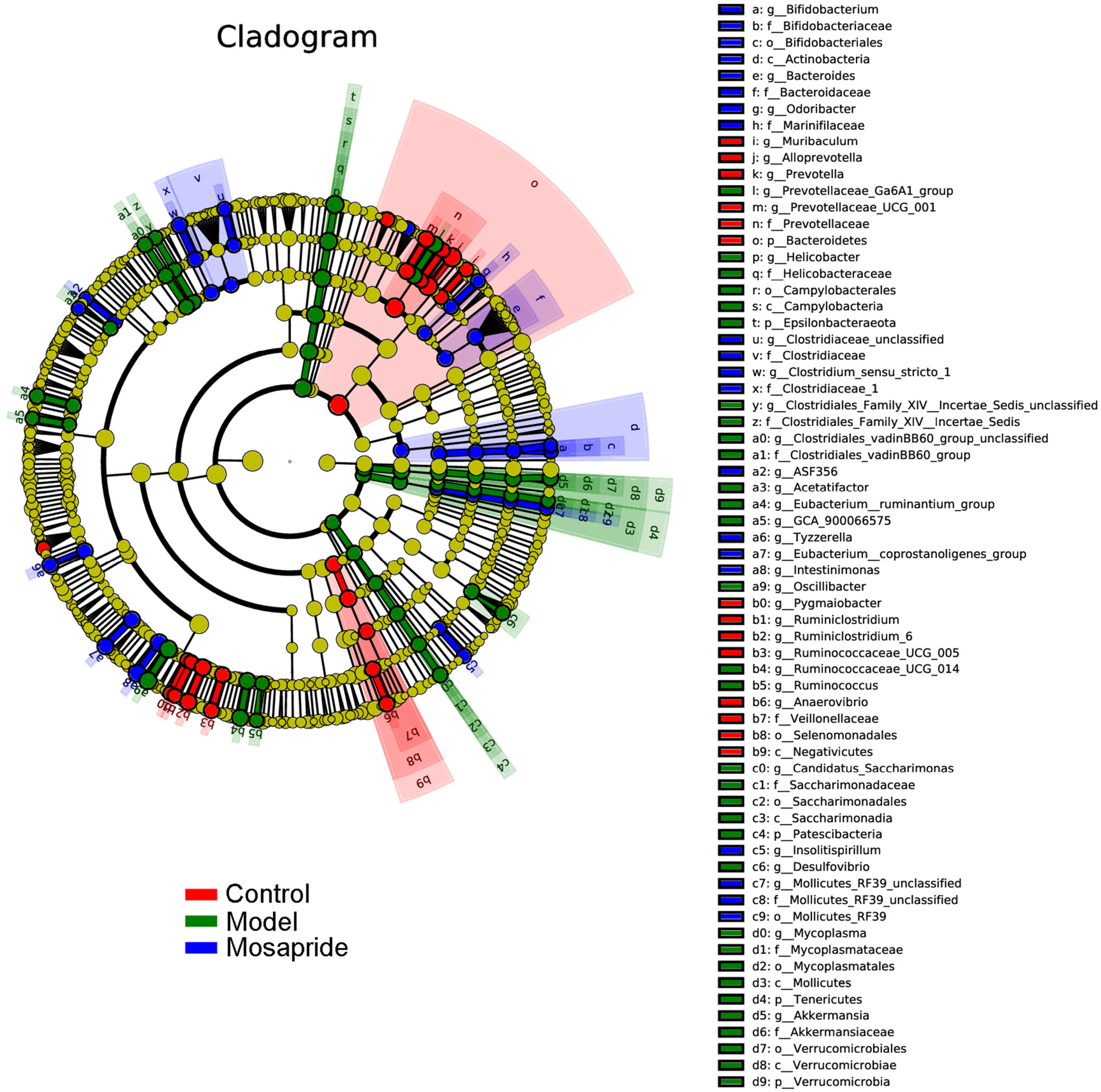 The LEfSe analysis was conducted to identify bacteria that may be involved in the pathological changes of the lesions. The LEfSe cladogram showed the bacteria that played the most important roles in each group. As shown in Figure 6, 14 dominant bacteria were found in the control group, 32 dominant communities in the model group and 20 dominant communities in the mosapride group. In the control group, the crucial genera included Bacteroidetes, Prevotellaceae, Alloprevotella, Ruminiclostridium, Negativicutes, Selenomonadales, Veillonellaceae, and Anaerovibrio. In the model group, the closely related bacteria included Campylobacterales, Epsilonbacteraeota, Helicobacter, Oscillibacter, Prevotellaceae_Ga6A1_group, Verrucomicrobiales, and Akkermansia. In the mosapride group, the bacteria included Intestinimonas, Eubacterium, Clostridiaceae, Clostridium, Bacteroidaceae, Bacteroides, Tyzzerella, Actinobacteria, and Bifidobacteriales.