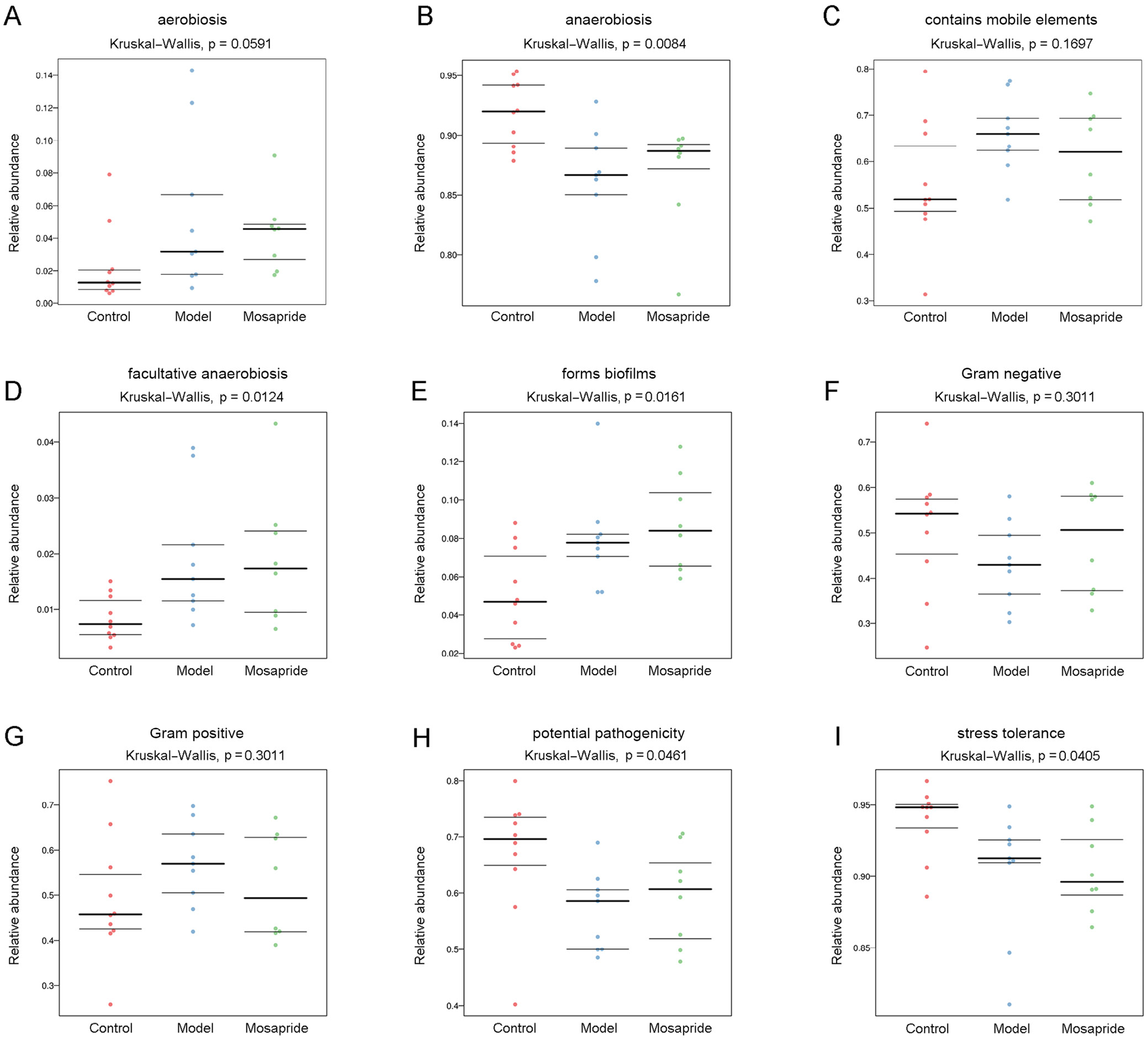 After screening gut microbiota, the prediction of bacterial phenotypes was conducted. Mosapride may change bacterial phenotypes related with cirrhosis, and these phenotypes included anaerobiosis, facultative anaerobiosis, biofilm formation, potential pathogenicity, and stress tolerance. However, little is known about the exact roles of microbiota in the pathogenesis of liver diseases. In the future, more studies are required to investigate the correlation between bacterial phenotypes and the pathogenesis of hepatic cirrhosis.