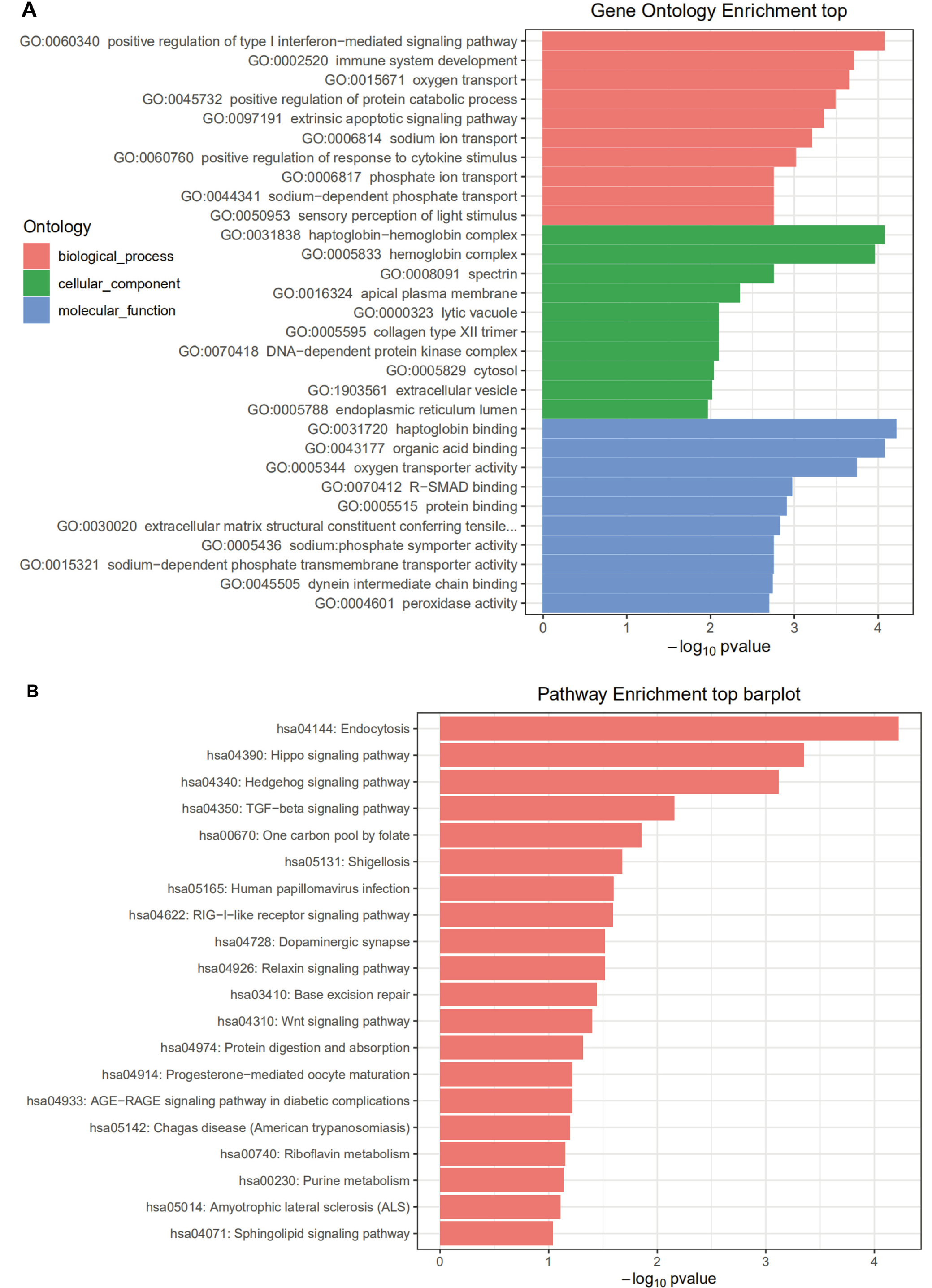 The mRNA-targeted binding genes were used as the target gene. The GO and KEGG pathway annotation of the species were used for enrichment analysis. By classifying, sorting and analyzing GO functional annotations, the differences in the GO annotation distribution of different target gene sets were displayed in the form of a bar graph, and the biological significance of corresponding miRNAs was explored. The software used for GO enrichment analysis was clusterProfiler (https://www.rdocumentation.org/packages/clusterProfiler