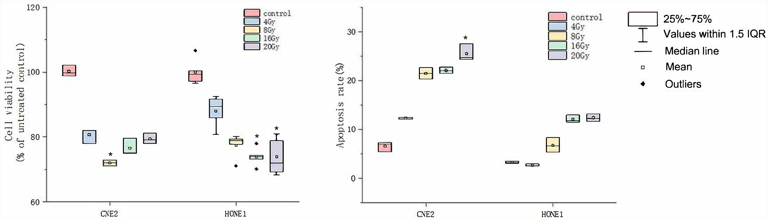 When the cells were inoculated to 70% confluence, the model was initiated and 2 types of cells (HONE1 and CNE2) were treated with X-rays at 4 Gy, 8 Gy, 16 Gy, and 20 Gy doses. After treatment, flow cytometry apoptosis detection and Cell Counting Kit-8 (CCK-8) detection were performed.