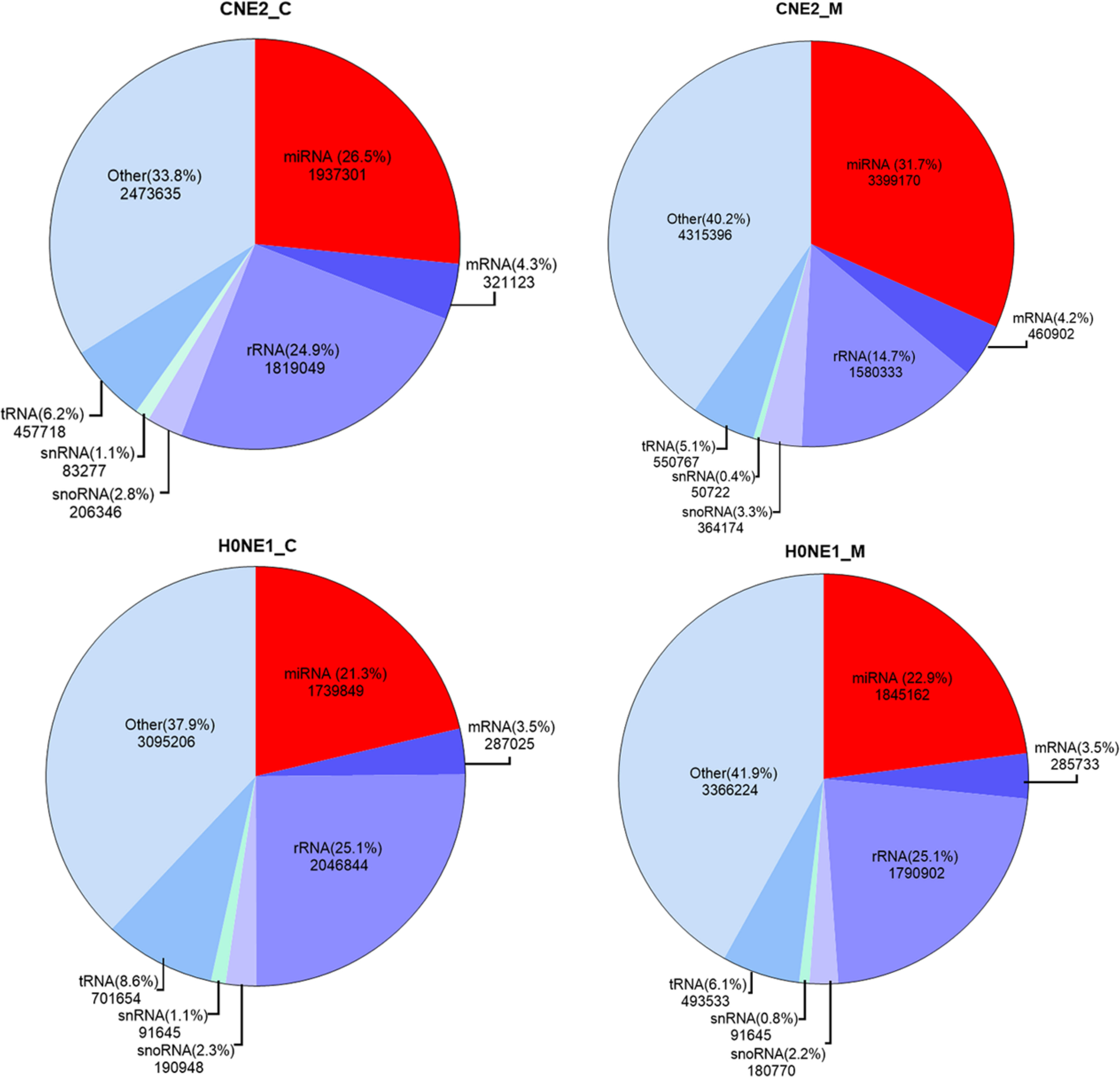 Blastn search tool was used to compare the reads in CNE2_C, CNE2_M, HONE1_C and HONE1_M with tRNA, snRNA, snoRNA, rRNA, mRNA, and miRNA in the Rfam database. The number and percentage of reads of the comparison were calculated, and a pie chart was built (Figure 2). The miRNAs accounted for 26.5%, 31.7%, 21.3%, and 22.9% of the Cleandata reads count in CNE2_C, CNE2_M, HONE1_C and HONE1_M, respectively. The contents of tRNA, snRNA, snoRNA, rRNA, and mRNA are shown in Figure 2. The contents of rRNA were relatively high, with 24.9%, 14.7%, 25.1%, and 25.1% of the Cleandata reads count, respectively.