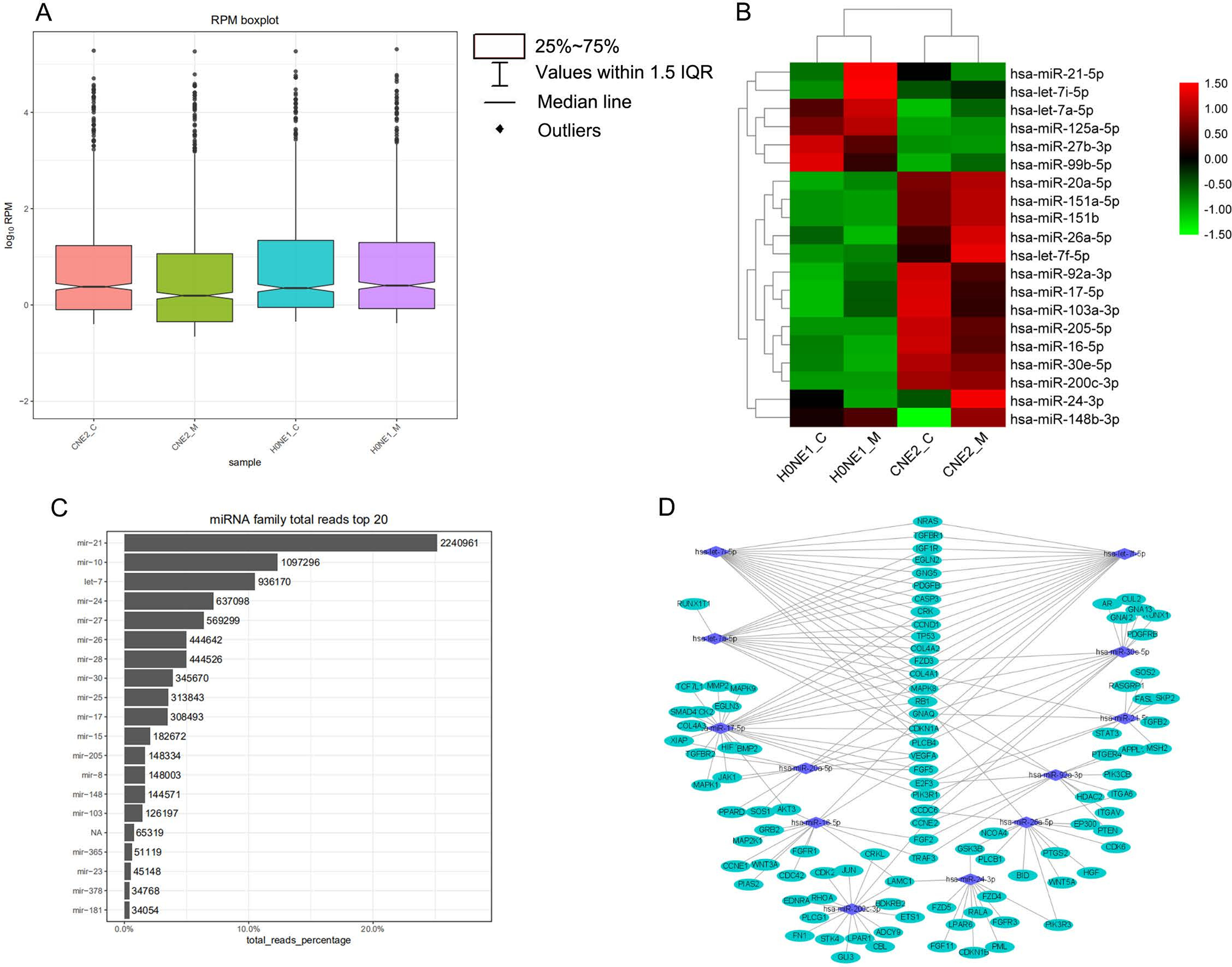 In order to show the overall expression distribution of miRNAs in each group, the RPM log10 of miRNAs in each group was taken and a box plot was built, as shown in Figure 3A. It can be seen that the median of the CNE2_M group was lower than in the other groups, indicating that in the CNE2_M group, there were more miRNAs with low expression levels. However, in the quality control analysis, the miRNA_total_reads of the CNE2_M group was higher than of the other 3 groups, indicating that the expression levels of some miRNAs in the CNE2_M group was abnormally high. We took the top 20 miRNAs in expression for heat map cluster analysis, as shown in Figure 3B. The Z-cord value of RPM was used for the heat map cluster analysis. Red represented high expression and green represented low expression. It could be seen that in the CNE2_M group, the amount of miRNAs with expressions which appeared red was higher than in the other 3 groups. The expressions of the HONE1 cells were low and appeared as green miRNAs, while most of those in the CNE2 group were relatively high and appeared red. Among them, there were significant differences in the expressions of hsa-miR-21-5p, hsa-let-7a-5p, hsa-miR-125a-5p, hsa-miR-26a-5p, hsa-let-7f-5p, hsa-miR-20a-5p, and hsa-miR-24a-3p between the HONE1 and CNE2 cell lines. There were also differentially expressed miRNAs in HONE1_C vs. HONE1_M, such as hsa-miR-21-5p and hsa-let-7i-5p, and in CNE2_C vs. CNE2_M, such as hsa-miR-148b-3p.