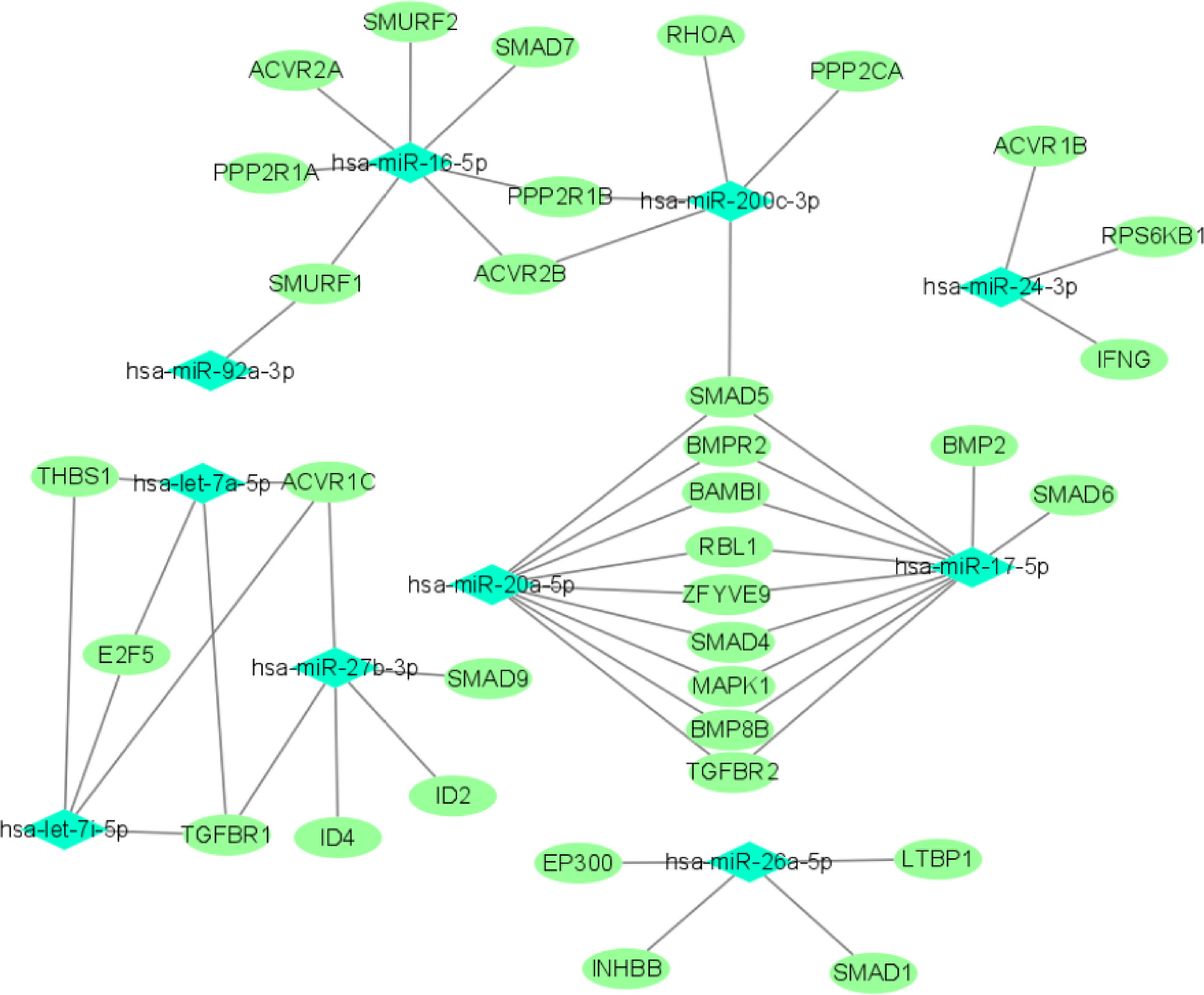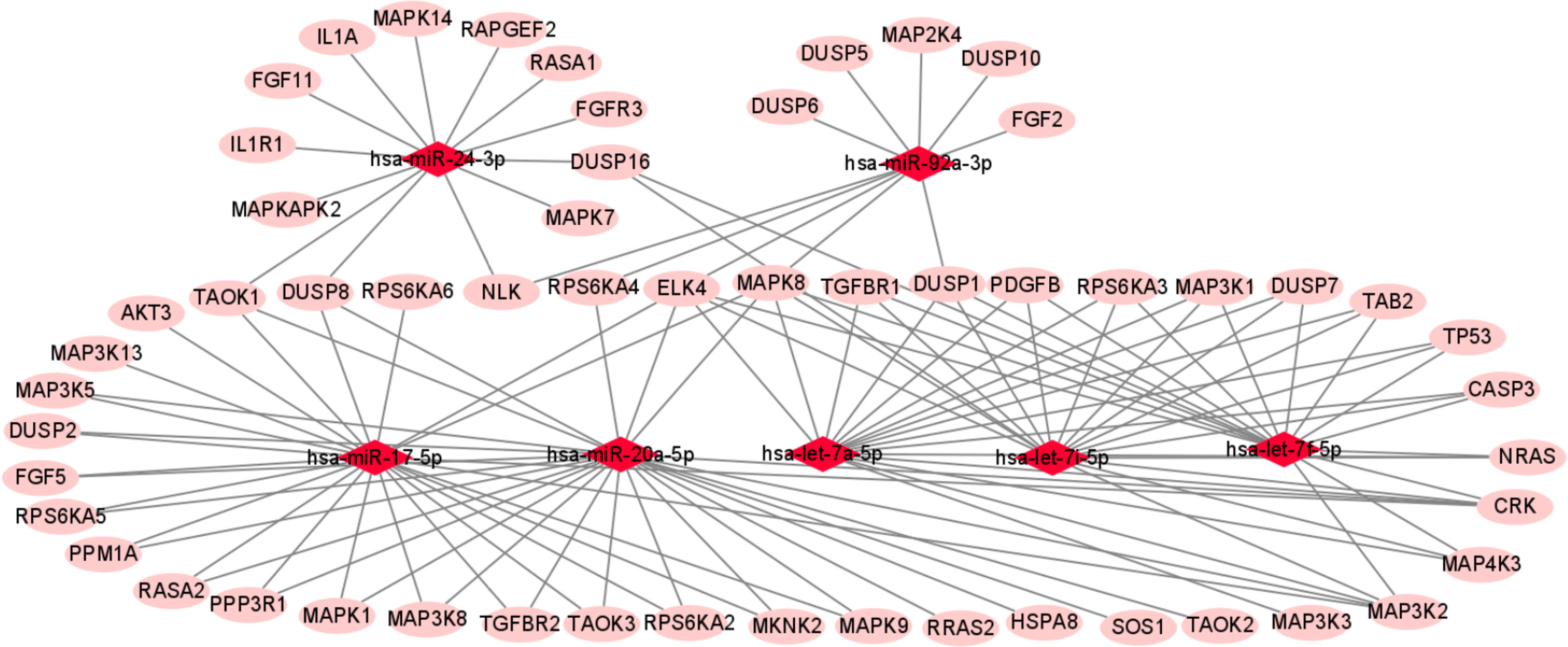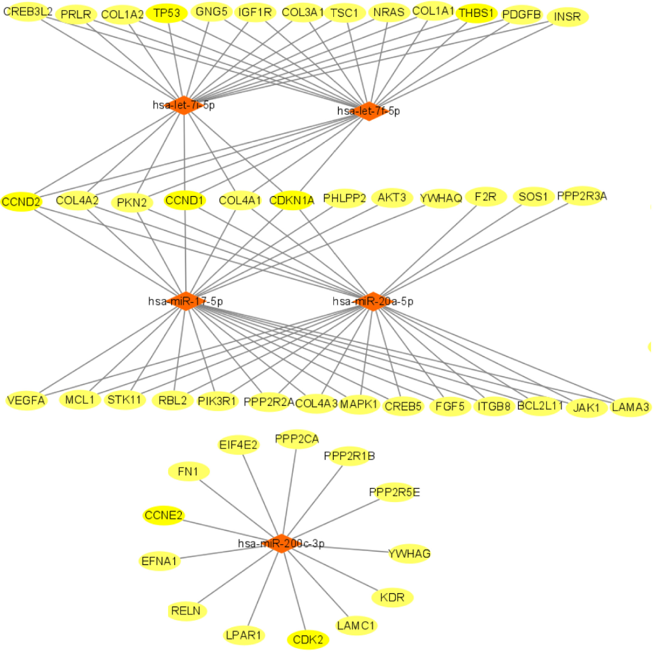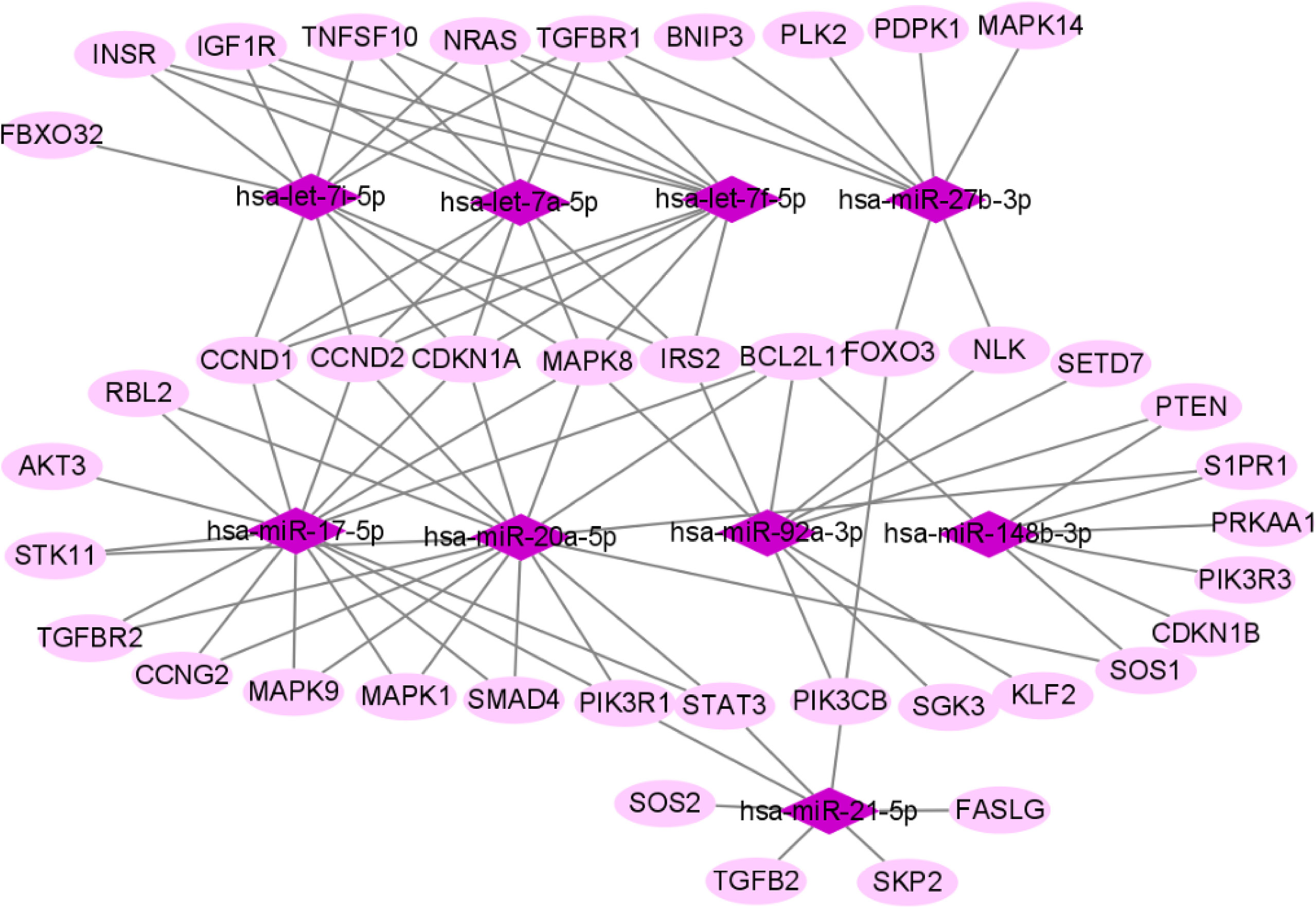 The gene analysis of the interactions of various pathways found that hsa-miR-17-5p and hsa-miR-20a-5p in the cancer, TGF-β, PI3K-Akt, MAPK, and FoxO signaling pathways co-regulated MAPK1, son of sevenless homolog 1 (SOS1) and transforming growth factor beta receptor II (TGFβR2) genes. The hsa-let-7a-5p, hsa-let-7f-5p and hsa-let-7i-5p in the cancer, TGF-β and MAPK pathways targeted and regulated the TGFβR1 gene. The hsa-let-7a-5p, hsa-let-7f-5p and hsa-let-7i-5p in the cancer, MAPK and p53 signaling pathways targeted and regulated the tumor protein 53 (TP53) and caspase 3 (CASP3) genes. The hsa-miR-30e-5p, hsa-miR-92a-3p and hsa-miR-200c-3p in the cancer, p53 and PI3K-Akt signaling pathways targeted and regulated the cyclin E2 (CCNE2) gene. The hsa-miR-92a-3p, hsa-miR-26a-5p and hsa-miR-148b-3p in the cancer, p53 and FoxO signaling pathways targeted and regulated phosphatase and tensin homolog (PTEN) gene. The hsa-miR-200c-3p in the cancer, p53 and PI3K-Akt signaling pathways targeted and regulated the CDK2 gene. The specific miRNA corresponding pathways and target genes are shown in Table 2.