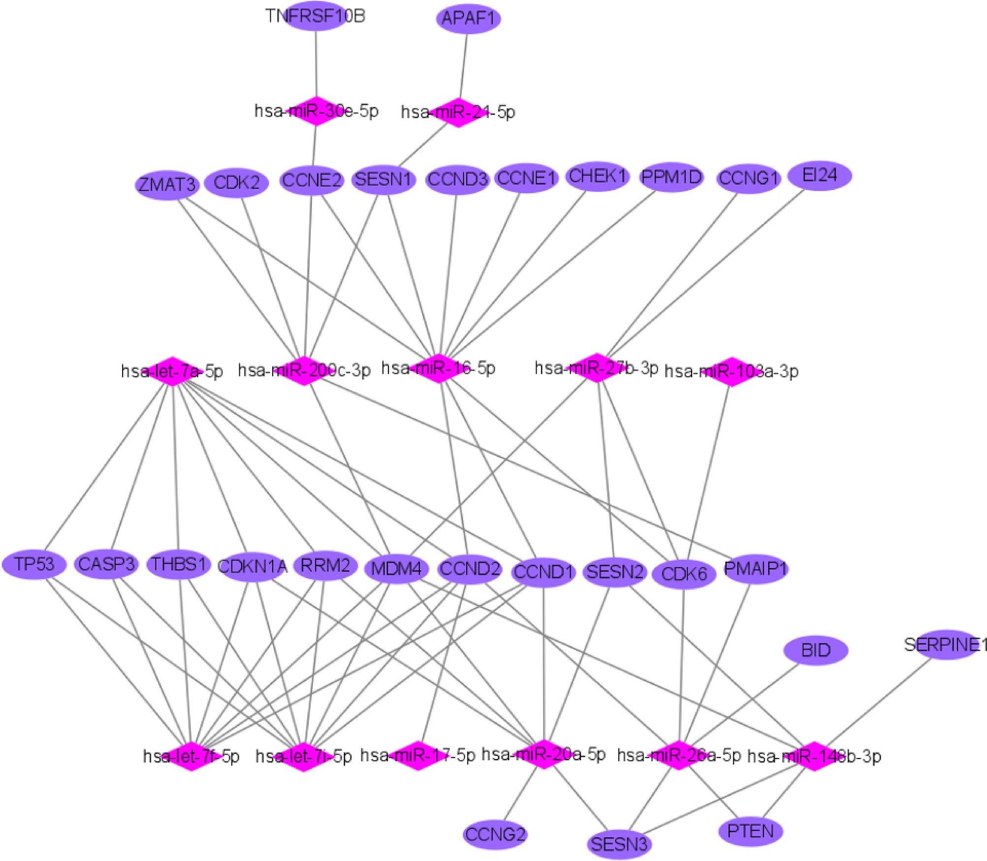 The miRTarBase (http://www.targetscan.org/vert_72/) was used to predict the target genes that the miRNAs might bind to in the cancer gene pathway. The miRDB database was used to rescreen genes that might interact with miRNAs. TargetScan database is a predictor that produces predicted interactions, while miRTarBase and miRDB databases provide verified target genes that have binding sites with miRNAs. The miRNAs and target genes that play a role in cancer genes were screened out and the miRNA-gene interaction network was constructed using Cytoscape v. 3.8.0 (https://cytoscape.org/).
