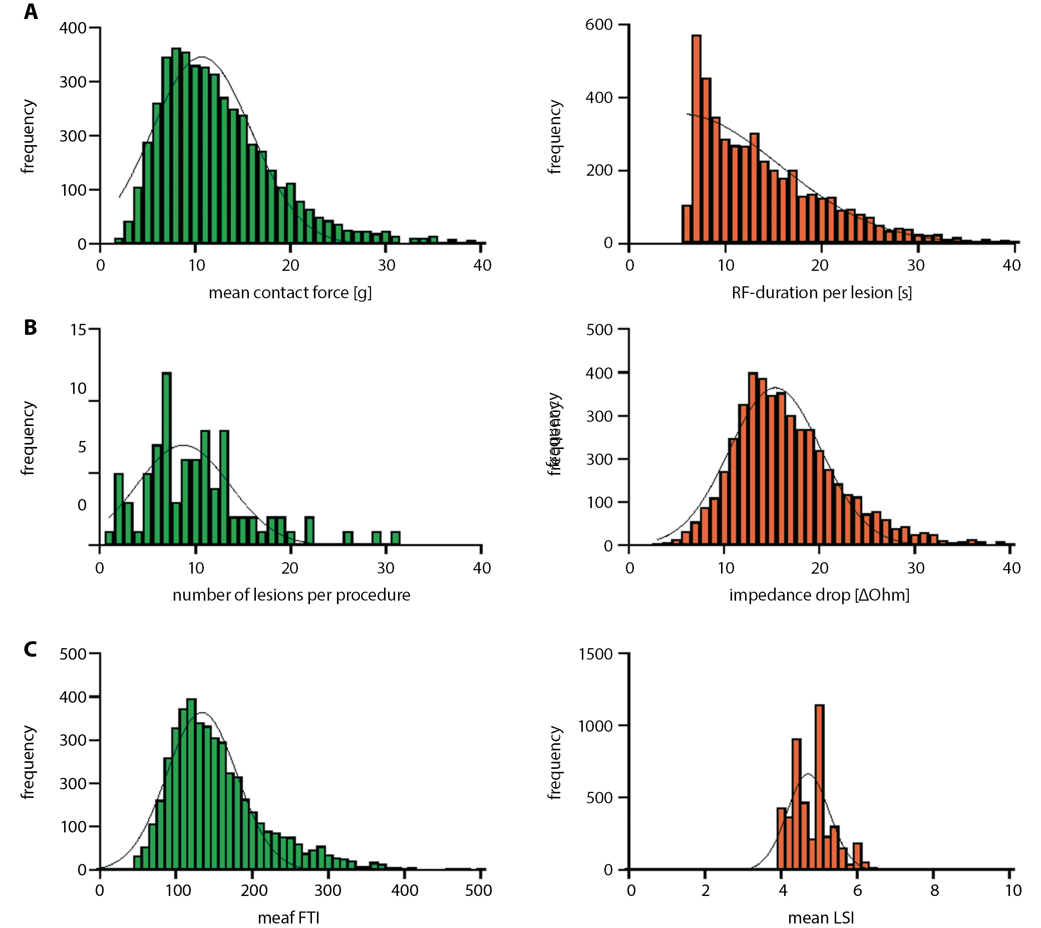 For each patient, we recorded the pre-ablation clinical characteristics. For each ablation pulse, we obtained duration of RF application, impedance, power, CF, force time integral (FTI), and LSI. All ablation parameters were analyzed and grouped according to the different atrial regions: left/right upper and lower PV and anterior/posterior LA wall. Furthermore, the rate of acute pulmonary vein isolation (PVI), total RF ablation time, fluoroscopy time, and procedure time (skin-to-skin) were documented. The occurrence of steam pops was noted by the operators. Transthoracic echocardiography was performed after the procedure on the same day to exclude pericardial effusion.