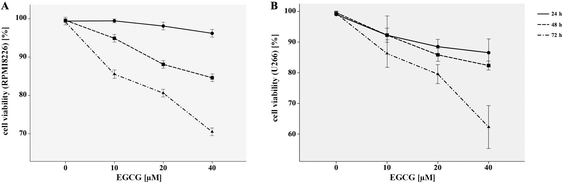 The MTT assay was applied to explore the effects of EGCG on the viability of myeloma cell lines as RPMI8226 and U266. As demonstrated in Figure 1A,B, EGCG played a significantly inhibitory role on proliferation of both RPMI8226 and U266 cells in a time- and dose-dependent manner, when compared with the control ones. Our results indicated that EGCG had the antiproliferative effect on MM cells without cytotoxic effects on normal hematopoietic cells.