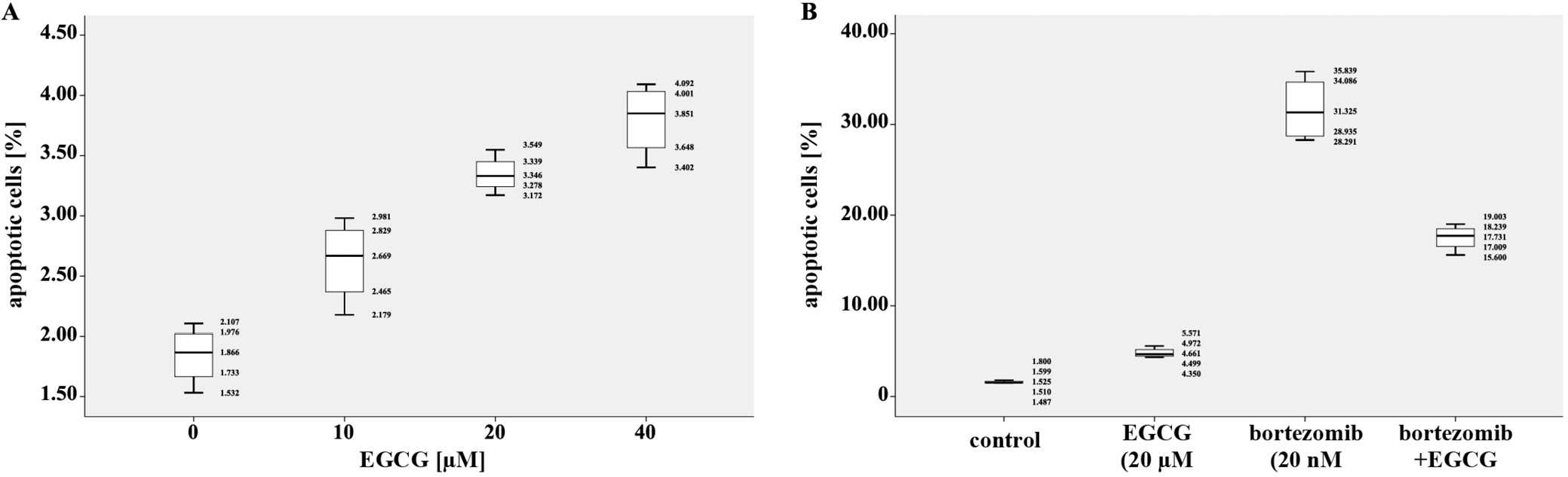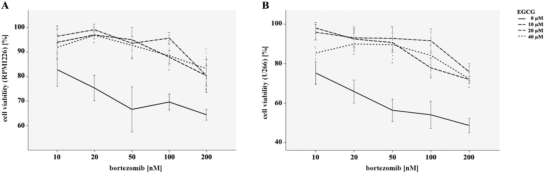 As was shown in our data, the inhibitory influence of bortezomib on the myeloma cells proliferation was dose-dependent – it increased with concentration. To further investigate the effect of EGCG combined with bortezomib, RPMI8226 and U266 cells were incubated with EGCG at a concentration of 10 μM, 20 μM and 40 μM and bortezomib (10–200 nM) for 24 h in vitro. Figure 2 shows that the myeloma cell viability was significantly increased under the combination of 2 drugs when measured with MTT assay, as compared with the group treated with bortezomib alone. These results demonstrated that EGCG could minimize the antitumor efficacy of bortezomib on myeloma cells.