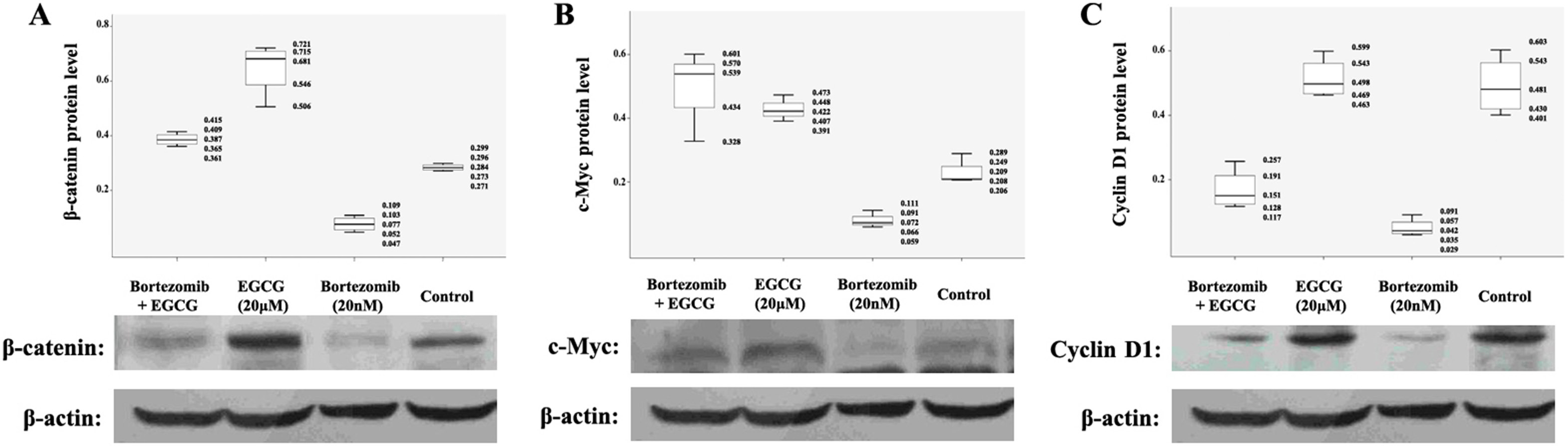 Results. Our results showed the inhibitory activity of EGCG on myeloma cells in a time- and dose-dependent manner. The EGCG neutralized the antiproliferative and pro-apoptotic effect induced by bortezomib by activating Wnt/β-catenin signaling pathway with the accumulation of β-catenin. An increase of the downstream target proteins as c-Myc and cyclin D1 was also observed. was also observed. These findings demonstrated the antagonistic role of EGCG in the antitumor effect of bortezomib likely through the activated Wnt/β-catenin signaling pathway and the upregulated target proteins.