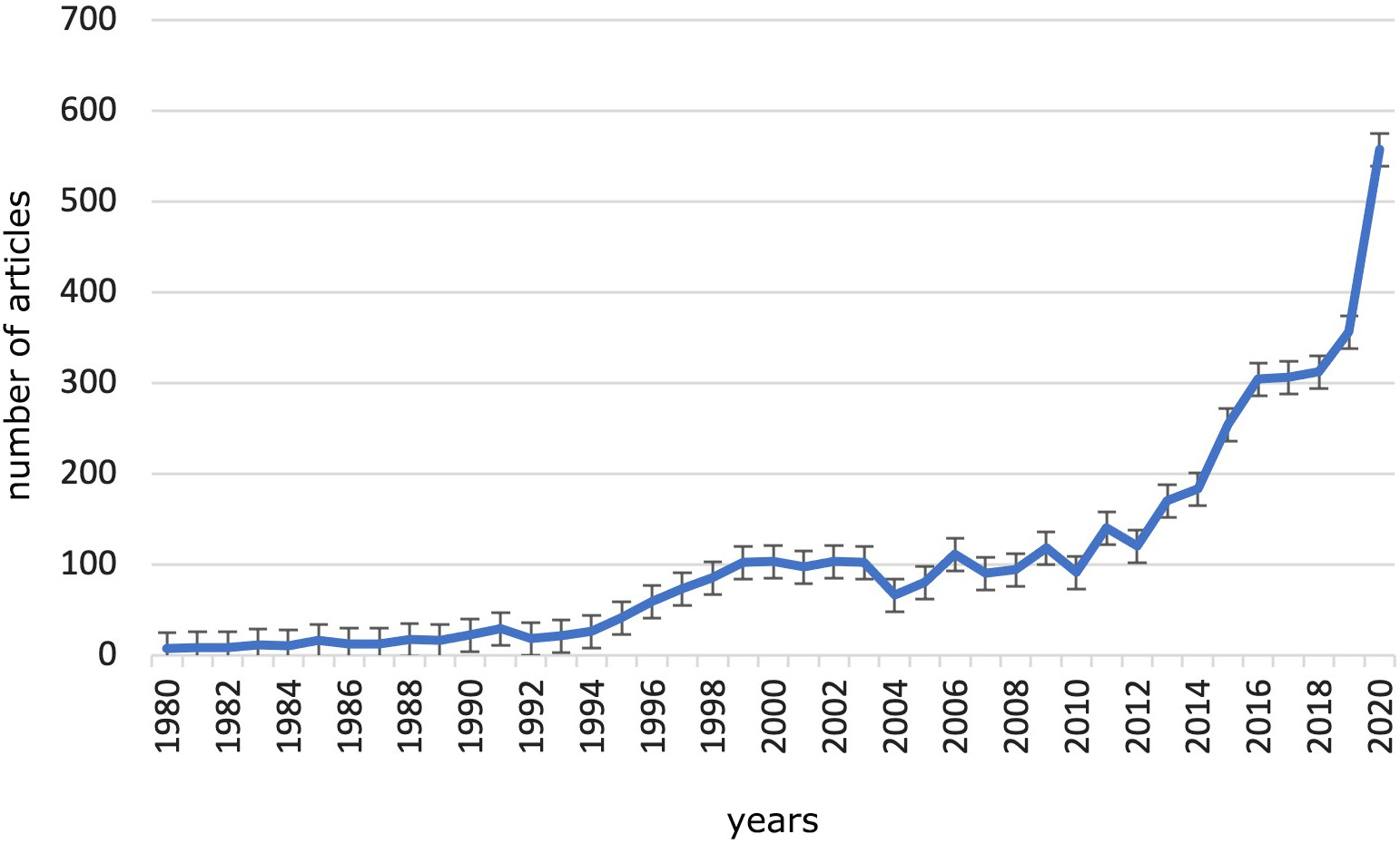 In the 1980s, the period immediately after ARDS was first described, we did not observe a significant increase in the number of ARDS studies. After the mid-1990s, the number of ARDS articles increased each year. In 1994, the American-European Consensus Conference on ARDS published a consensus report to bring clarity and uniformity to the ARDS definition and attract attention to mechanisms of the disease.3 In this report, the need for studies on ARDS was strongly emphasized, and a large part of the report was devoted to recommendations for future studies. Therefore, the effect of this consensus report on increasing the number of ARDS studies cannot be ignored. A 2nd increase in the number of ARDS studies came after 2012 when the Berlin definition of ARDS was released.2 Finally, in 2019 and 2020, the number of publications related to ARDS in coronavirus disease 2019 (COVID-19) increased, likely due to the fact that COVID-19 leads to ARDS in 16–31% of hospitalized patients.32