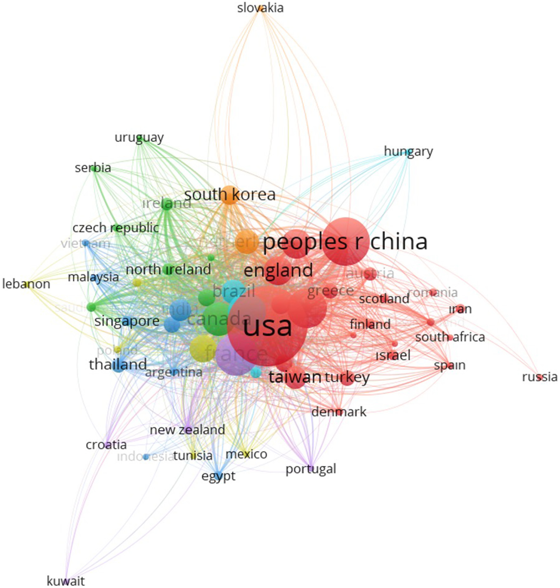 According to the WoSCC database, 4350 articles originated from 129 countries. The top 25 countries contributing to ARDS articles between 1980 and 2020 are depicted in Figure 2. The USA was at the top of the list with 5025 articles. China (n = 2146), France (n = 1676), Germany (n = 974), Italy (n = 941), Canada (n = 883), Japan (n = 781), Spain (n = 756), the UK (n = 516), Brazil (n = 503), and the Netherlands (n = 425) followed the USA.