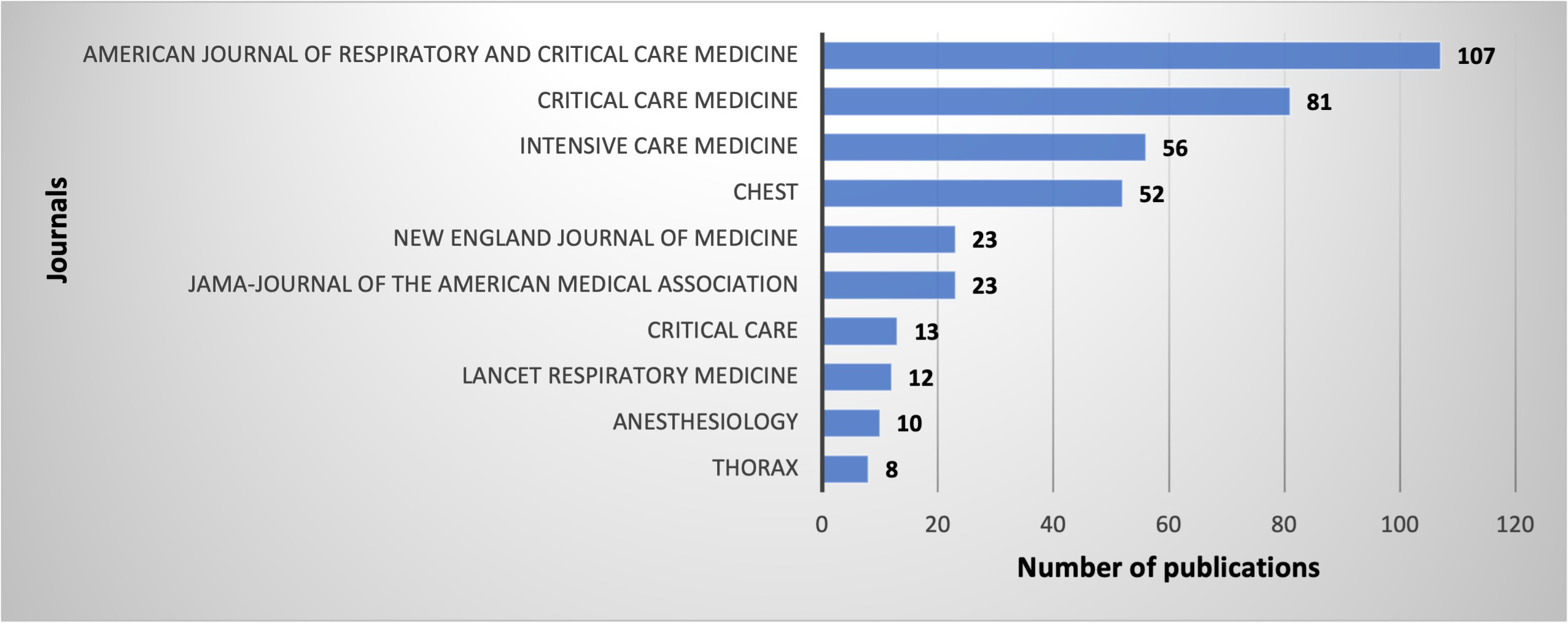 Eight of the 10 most cited ARDS articles were published in New England Journal of Medicine (n = 6) and JAMA (n = 2). In contrast, 107, 81, 56, and 52 of the top 500 most cited articles were published in American Journal of Respiratory and Critical Care Medicine, Critical Care Medicine, Intensive Care Medicine, and Chest, respectively. These findings suggest that journals with the highest IFs and those categorized as “general medicine” have published fewer but more influential articles than others classified as “critical care medicine” or “intensive care medicine.” Since ARDS is still a syndrome with a high mortality in critically ill patients in ICUs, it is not surprising that ARDS articles are published in these journals.